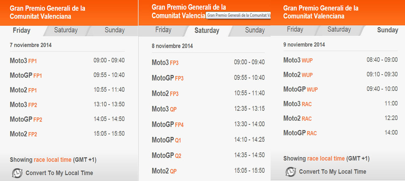 A continuación se detallan los horarios de esta competición de Moto GP 2014, los días 7, 8 y 9 de noviembre.