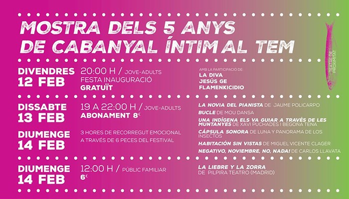 Muestra de 5 años de Cabanyal Íntim en el TEM El Teatre El Musical del Cabanyal alberga una selección de las mejores obras de las cinco ediciones de Cabanyal Íntim ¿Cuándo? Fecha Del Friday, 12 de February del 2016 al Sunday, 14 de February del 2016 HORA 12:00 h ¿Dónde? LUGAR Teatro Musical del Cabanyal Plaza del Rosario, 3 Ver ficha El Teatre El Musical del Cabanyal (TEM) acoge, del 12 al 14 de febrero, una muestra con la selección de obras del festival Cabanyal Íntim. ¿No sabes qué hacer en Valencia? Consulta la agenda de Valencia con toda la información sobre teatro en Valencia. Cabanyal Íntim es un festival que lleva cinco años dinamizando el barrio y aportando su granito de arena en la cultura y en las reivindicaciones vecinales. El TEM quiere hacer un homenaje a su labor con la Muestra de los 5 años del Cabanyal Íntim, un fin de semana de reposición de algunas de las obras de teatro, danza y performance en Valencia más representativas de este encuentro. Consulta en la imagen inferior toda la información sobre horarios y precios, y no te pierdas una oportunidad de volver a ver sobre los escenarios algunos de los espectáculos más rompedores de la historia del Cabanyal Íntim. Artículos relacionados Qué hacer en Valencia Fallas 2025 Teatro Valencia