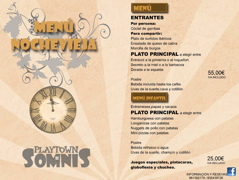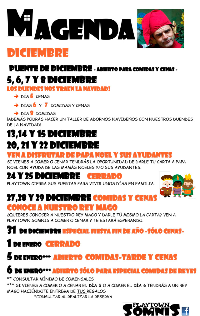 Navidad con niños en Playtown Somnis Si no sabes donde comer con niños en Valencia en PlayTown Somnis organizan con motivo de la Navidad en Valencia, actividades y cenas temáticas para que los peques lo pasen en grande ¿Cuándo? Fecha Del Sunday, 01 de December del 2019 al Sunday, 05 de January del 2020 HORA 12:00 h ¿Dónde? LUGAR Playtown Somnis Plaça Dos de Maig, núm. 3 Ver ficha Playtown Somnis prepara con motivo de la Navidad en Valencia, actividades para que los peques de la casa se lo pasen genial. Si quieres disfrutar de los planes con niños en Valencia y del resto de eventos que se celebran en la ciudad, echa un vistazo a nuestra agenda de Valencia. Diciembre es un mes repleto de magia e ilusión. Por ello, el mes comienza en Playtown Somnis de la mano de divertidos duendes que traerán la Navidad. Además si vas a comer o cenar a este restaurante para niños durante el finde del 13, 14, 15, o el previo a Nochebuena (días 20, 21 y 22) tendrás la oportunidad de darle tu carta a Papa Noel. Los peques disfrutarán con los ayudantes de Papa Noel y las Mamás Noeles.¡Y esto no acaba aquí!. Los días 24 y 25 de Diciembre PlayTown Somnis permanecerá cerrado pero vuelven el último finde del año con más magia y alegría. ¿Quieres conocer al Rey Mago y darle tu carta, en PlayTown Somnis te estarán esperando el 27, 28 y 29 de diciembre. Si celebras los Reyes Magos con Playtown Somnis (5 y 6 de enero) habrá un Rey Mago para hacerte la entrega de tus regalos y el 5 de enero también podrás darle la carta de reyes. (*Previa reserva) Con motivo de la Nochevieja en Valencia, este local para niños ofrece un especial fiesta de fin de año. Celebra el final del 2019 entre amigos o familiares mientras los peques se lo pasan en grande en la ciudad en miniatura de PlayTown. ¡Empezarán el año lleno de alegría! (Consulta el menú más abajo) Si no sabes qué hacer con niños en Valencia, este es un plan perfecto para que los peques de la casa se lo pasen genial. Playtown Somnis se encuentra en Plaça del Dos de Maig, 3 CP 46980 Paterna (Valencia).Para más información o reservas puedes llamar al 961 382 179 // 655 439 726 o escribir un correo a [email protected] ¡Echa un vistazo a la programación de diciembre en Playtown Somnis! Menú Nochevieja Playtown Somnis 2019 Artículos relacionados Concierto Disney en València Las mejores tortillas de Valencia 40ª edición San Silvestre Valencia 2025 Patina en familia sobre hielo