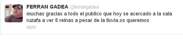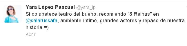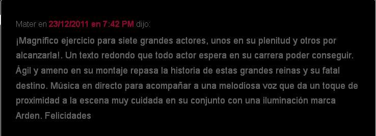8 Reinas en el Teatro Russafa La obra sobre 8 Reinas de gran poder interpretadas por 8 hombres, además música en directo ¿Cuándo? Fecha Del Thursday, 18 de October del 2012 al Sunday, 11 de November del 2012 HORA 01:00 h ¿Dónde? LUGAR Sala Russafa C/ Denia, 55 Ver ficha Puedes disfrutar del teatro con 8 Reinas. Una original obra de teatro que estará en la Sala Russafa del 18 de octubre al 11 de noviembre. Todos los jueves, viernes y sábados a las 20:30 podrás entretenerte y disfrutar del ingenio y el buen trabajo de todo el equipo, así como los domingos a partir de las 19:00 horas. A través de 8 personajes históricos, ocho reinas que gobernaron en la historia, nos acercamos a sus vivencias como mujeres poderosas. Sus dificultades, obstáculos que tuvieron que sufrir por ser mujeres con poder. Sus miedos, sus fracasos, sus relaciones con un mundo creado y diseñado para el hombre. Os dejamos unas opiniones de gente que ya ha acudido a la obra y de uno de los actores: Las reinas protagonistas de esta obra son: María Estuardo, Catalina la grande de Rusia, Isabel la católica, Cristina de Suecia, Isabel II de España, María Tudor, Juana la loca y Elizabeth I, que estarán encarnadas en el cuerpo de ocho hombres que nos hablan de temas aún no se resueltos en nuestra sociedad. Además el espectáculo va acompañado de música en directo, con temas muy conocidos y de grupos de todos los tiempos como por ejemplo The Beatles. Una voz de una mujer, testigo de las voces de unos hombres tratando de acercarse a estas grandes reinas de la historia. Compra ya tus entradas para 8 Reinas y disfruta de todo lo que esta fantástica obra te puede ofrecer. Además el jueves por ser el día del espectador, la entrada tiene un coste único de diez euros. Artículos relacionados Ángel Martín y Ricardo Castella en el Teatro Flumen Festival La Cabina en Valencia Forever Young, el musical en Valencia Exposición de Andy Warhol en Valencia