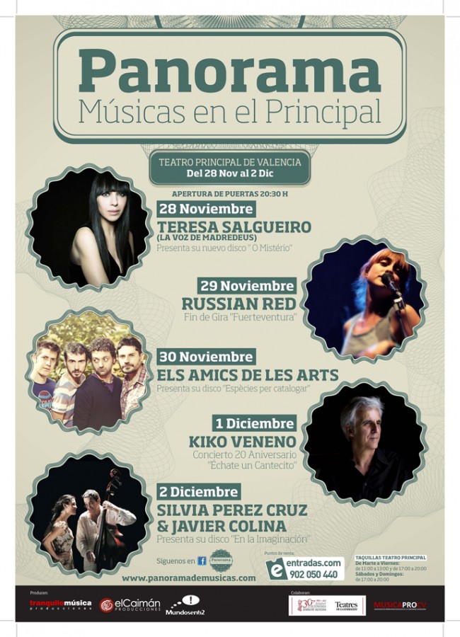 Panorama Músicas en el Principal de Valencia 2012 Llega el Festival Panorama a Valencia desde el 28 de noviembre al 2 de diciembre en el Teatro Principal ¿Cuándo? Fecha Del Wednesday, 28 de November del 2012 al Sunday, 02 de December del 2012 HORA 01:00 h ¿Dónde? LUGAR Teatro Principal de Valencia C/ de las Barcas Ver ficha Panorama Músicas en el Principal, es una propuesta de conciertos en Valencia, con artistas destacados dentro de la escena musical actual. Músicos de referencia y de calidad, en estilos muy diversos como lo son el Jazz, Pop, Canción de Autor o Fusión. Los conciertos se realizarán en Teatro Principal ,situado en pleno centro de la ciudad de Valencia, en uno de los espacios escénicos más importantes de Valencia Desde el 28 de Noviembre al 2 de Diciembre se presentarán 5 conciertos bajo el nombre de Panorama que llega con una programación con los artistas que más han destacado durante el año en la escena musical tanto nacional e internacional. Programación Panorama Panorama da el pistoletazo de salida el Miércoles 28 de Noviembre, con la actuación de Teresa Salgueiro, voz de la conocida banda Madredeus, referencia de la música portuguesa que publica su primer trabajo “O Mistério”. Russian Red llegará al Teatro Principal el 29 de Noviembre donde finalizará su Gira “Fuerteventura”, su segundo álbum, producido, grabado y mezclado por Tony Doogan en Glasgow y tocado por músicos de Belle & Sebastian. Els Amics De Les Arts el 30 de Noviembre presentará su tercer disco, “Espècies per catalogar”. Kiko Veneno será el ecargado de amenizar la jornada del 1 de Diciembre, en el 20 Aniversario de su mítico disco “Échate un Cantecito”. Cerrará la programación el 2 de Diciembre, Silvia Pérez Cruz una de las mejores voces que ha dado la música popular en Cataluña en los últimos años. Una combinación del jazz y el flamenco. Presenta su nuevo trabajo junto a Javier Colina. Los conciertos serán a las 21:00 horas y las puertas se abrirán a las 20:30 horas Artículos relacionados Els Amics de les Arts en el Principal de Valencia Concierto de Russian Red en Valencia Festival Dial Tal Cual Valencia 2012 Concierto Kiko Veneno en el Principal de Valencia