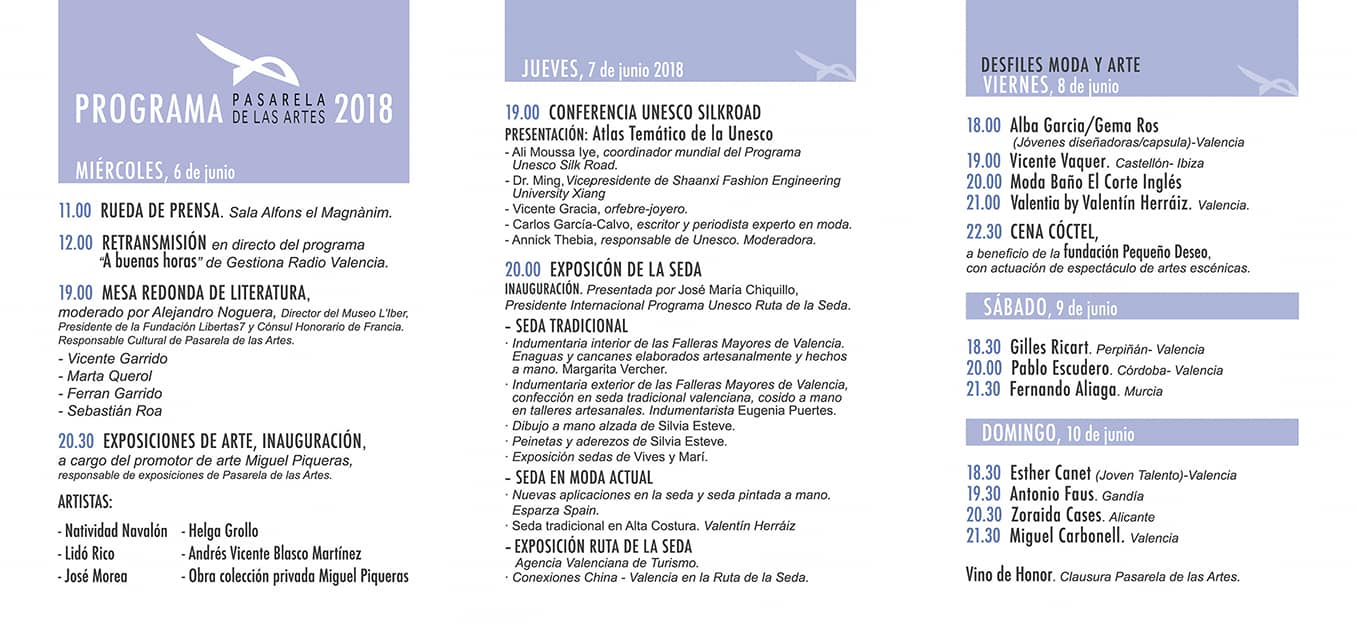 Pasarela de las Artes en València El Centro Cultural la Beneficencia será el escenario de la cuarta edición de una iniciativa que llega con lo mejor de la moda de València y más sorpresas ¿Cuándo? Fecha Del Thursday, 07 de June del 2018 al Sunday, 10 de June del 2018 HORA 10:00 h ¿Dónde? LUGAR Centro Cultural la Beneficencia C/ Corona, 36 Ver ficha Llega la cuarta edición del gran evento de moda en València, la Pasarela de las Artes. La Sala Alfons el Magnànim en el Centre Cultural de la Beneficencia se vestirá de gala del 7 al 10 de junio con gran variedad de actividades. Consulta nuestra agenda para encontrar más eventos y cosas que hacer en València. La Pasarela de las Artes nos vuelve ha sumergir en el mundo de la moda a diferentes niveles. Esta edición promete no decepcionar a los amantes de la moda. Además de las habituales exposiciones y desfiles de moda, se podrá disfrutar de reuniones con literatos, música, danza, charlas y mucho más. También será posible conocer a prestigiosos diseñadores y nuevas promesas valencianas, o descubrir creaciones únicas que combinan diferentes géneros. Cabe destacar que la Pasarela de les Arts consiguió el reconocimiento de la UNESCO y que forma parte del programa de acrividades “Valencia,ciudad de la Seda 2016”. Programación Cartel Artículos relacionados Agenda de eventos gratuitos en Valencia Mercado de L’Escuraeta Festival Tercera Setmana Rutas turísticas “Entre Comarques” de València