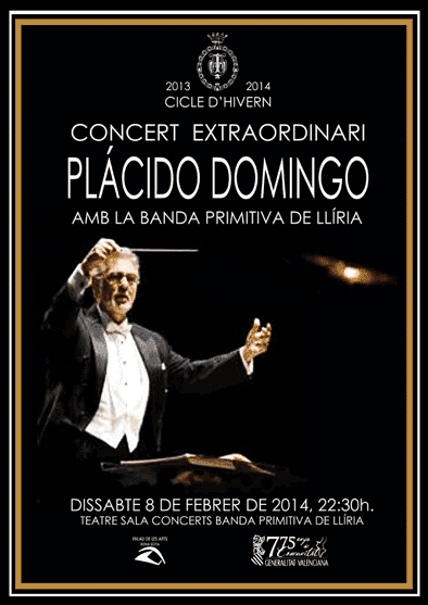 Plácido Domingo dirigirá la Banda Primitiva de Llíria El tenor madrileño Plácido Domingo dirige este "Concierto Extraordinario" ¿Cuándo? Fecha Del Saturday, 08 de February del 2014 al Saturday, 08 de February del 2014 HORA 00:00 h ¿Dónde? LUGAR Llíria Plaza Mayor Ver ficha El Teatro Sala de conciertos Primitiva de Llíria recibe al tenor Plácido Domingo, el 8 de febrero a las 22:30. El cantante de ópera y director de orquesta cogerá la batuta y se pondrá al frente de la Banda Primitiva de Llíria. Es la primera vez que Plácido Domingo visita Llíria, y lo hace con motivo de este “Concierto Extraordinario”. Por su parte La Banda Primitiva de Llíria conocida también como “El Clarín” ha sido dirigida por directores consagrados como: Luis Cobos, Odón Alonso, Manuel Galduf, entre otros; ha viajado por Estados Unidos, China y Europa; y ha dado más de 3 mil conciertos durante el pasado siglo XX; se trata de la banda de música civil más antigua de España. El aforo del teatro está completo, ya que las entradas se pusieron a la venta con mucha antelación y se agotaron rápidamente. El acto pertenece al Cicle d’Hivern que la Banda Primitiva organiza cada año, en el que colabora el Palau de les Arts y de la Generalitat Valenciana. Un lujo poder disfrutar de este acontecimiento.