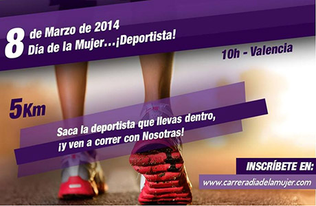 Primera Carrera de la Mujer “8 de Marzo” La mujer toma protagonismo en el deporte ¿Cuándo? Fecha Del Saturday, 08 de March del 2014 al Saturday, 08 de March del 2014 HORA 10:00 h ¿Dónde? LUGAR Cauce del Turia Alameda Ver ficha Con motivo del Día Internacional de la Mujer se celebra en Valencia la I Carrera de la Mujer “8 de Marzo”, una carrera popular femenina que promueve la participación de la mujer en todos los ámbitos sociales. La carrera se celebra el sábado 8 de marzo a las 10 de la mañana, y discurrirá por un recorrido de cinco kilómetros, con salida y meta en las pistas del cauce. La carrera se celebra en las pistas de atletismo del Jardín del Turia con la colaboración de la asociación “Nosotras Deportistas“. Su representante Mara Aparicio ha comentado que esta iniciativa novedosa, trata de acercar el deporte a las mujeres, puesto que es una fuente de salud física, emocional y social, y el deporte no está llegando como debería a las mujeres, ni el deporte femenino está llegando como debería a la sociedad. *Las inscripciones se realizan desde su página web. A todas las correderas se les entregará la Bolsa de la Corredora con una camiseta técnica y regalos. Recorrido