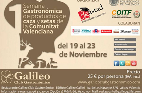 Semana Gastronómica de Productos de Caza y Setas en Valencia Primera Semana Gastronómica de Productos de Caza y Setas en Galileo Club ¿Cuándo? Fecha Del Monday, 19 de November del 2012 al Friday, 23 de November del 2012 HORA 01:00 h ¿Dónde? LUGAR Universitat Politècnica de València Camí de Vera, s/n Ver ficha Disfruta de la cocina más típica de esta época del año en la Primera Semana Gastronómica de Productos de Caza y Setas de la Comunidad Valenciana en Galileo Club Gastronómico del 19 al 23 de noviembre. Por sólo 25 euros por persona puedes disfrutar de este delicioso menú con los productos más apetitosos de la temporada y la calidad garantizada de Galileo Club Gastronómico: Entrantes (a compartir): Embutidos variados de ciervo y jabalí Canelón de setas variadas Ensalada variada de perdiz escabechada Plato principal (a elegir): “Ragout” de jabalí al aroma de romero Brocheta de ciervo y verduritas de temporada Arroz con pato y setas Postre (a elegir): Brownie de chocolate y nata Ensalada de frutas y helado de yogurt Café Vinos (a elegir): Angosto Blanco, D.O. Valencia La Tribu, D.O. Valencia La cocina mediterránea tiene un lugar especial en la carta del restaurante Galileo Club Gastronómico, con arroces preparados con especial delicadeza, pescados y carnes de elaboración cuidada y resultado único, culminado con suculentos postres y vinos que maridan de manera impecable con cada plato. Y para los que buscan algo más, pueden disfrutar en el Club Gastronómico de ventajas especiales para socios y multitud de actividades, catas, cursos y propuestas sorprendentes. Artículos relacionados Concierto David Bustamante en Valencia Concierto María Villalón en Valencia 2012 Ruta de la Tapa de Xirivella 2012 La Valencia Shopening Night el 29 de noviembre