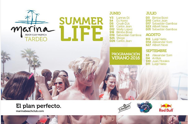 Programación de Verano en Marina Beach Club Valencia Marina Beach Club reúne este verano a los DJ'S más reconocidos del panorama musical en la sesión de tardeo ¿Cuándo? Fecha Del Friday, 03 de June del 2016 al Sunday, 11 de September del 2016 HORA 18:00 h ¿Dónde? LUGAR Marina Beach Club Valencia Calle Marina Real Juan Carlos I, s/n Ver ficha Marina Beach Club Valencia presenta para este verano un cartel compuesto por los DJ’S más destacados del momento que amenizarán al público con su música. Si no sabes qué hacer en Valencia, consulta la Agenda de Valencia, donde descubrirás los planes más destacados de la ciudad. Este local de moda en Valencia situado a orillas del Mar Mediterráneo cuenta con dos terrazas de verano en las que se puede disfrutar de sus cócteles mientras el público disfruta de la música y un ambiente increíble. Los fines de semana, Marina Beach invitará a DJ’S de la talla de Wally Lopez, Bimba Bosé, DJ Nano, Carlos Jean o Sebastián Gamboa. La programación de verano empezará el viernes 3 de junio y finalizará el 11 de septiembre. Además, Marina Beach ha inaugurado su Sky Bar, un rooftop (terraza sobre el tejado) donde se puede contemplar la playa de la Malvarrosa desde un entorno privilegiado. Asimismo, en este espacio se van a celebrar los ‘Jueves Ochen-teamé’ que contarán con los mejores DJ especializados en los 80. Programación de Verano Junio Viernes 3: Lunnas DJ Sábado 4: DJ Nano Domingo 5: Crush DJs Sábado 11: Carlos Jean Domingo 12: Wally López Sábado 18: Bimba Bosé Domingo 19: Sebastián Gamboa Sábado 25: Shega Domingo 26: Carlos Jean Julio Domingo 3: Bimba Bosé Domingo 10: Carlos Jean Domingo 17: Sebastián Gamboa Sábado 23: Albert Neve Domingo 31: Sebastián Gamboa Agosto Sábado 13: Luigi Nieto Domingo 14: Alexander Som Sábado 27: Albert Neve Septiembre Sábado 3: Alexander Som Domingo 4: Ardya Sábado 10: Juan Morales Domingo 11: Luigi Nieto Cartel de Summer Life Marina Beach: Sin duda, será un plan perfecto para este verano en Valencia. Artículos relacionados Verano Marina Beach Club Valencia