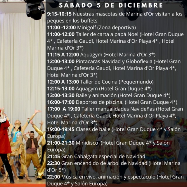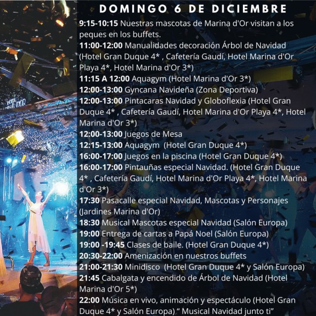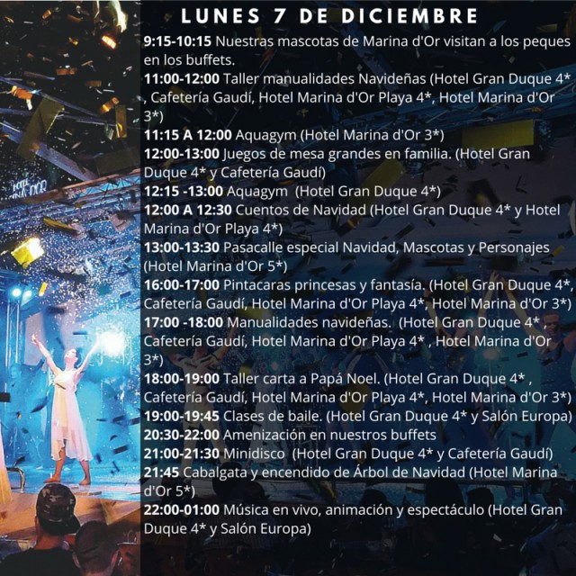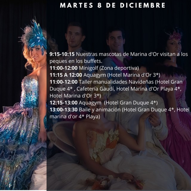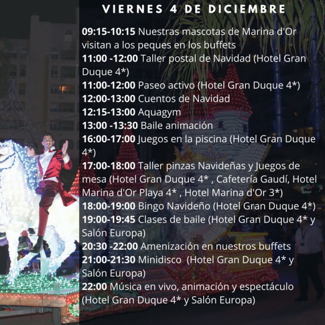 Puente de diciembre en Marina D’Or Marina d’Or se acerca a la navidad durante el puente de diciembre con una amplia oferta de actividades ¿Cuándo? Fecha Del Friday, 04 de December del 2015 al Tuesday, 08 de December del 2015 HORA 09:15 h ¿Dónde? LUGAR Marina D’Or Calle l'Antina, 3 Ver ficha Comprar entradas Marina D’Or celebra un año más el puente de diciembre a lo grande, para que puedas disfrutar en pareja o en familia. Consulta más planes en la agenda de Valencia. Como cada año, el puente de diciembre acerca las Navidades a Marina d’Or, con un millón de detalles tematizados que harán las delicias de grandes y pequeños. Durante estos días Marina D’Or Ciudad de Vacaciones ofrecerá un sinfín de actividades para dar la bienvenida a la navidad, pasacalles especial con las mascotas del complejo, musical, clases de baile, cabalgata, el encendido del árbol de navidad, gyncanas y varios talleres para niños y adultos. Aprovecha el Puente de Diciembre al máximo con las ofertas que ofrece Marina d’Or. Disfruta de sus ocho parques de ocio, el balneario y sus cursos. Si vienes en familia, los niños se lo pasarán en grande con las actividades para niños en Valencia. Consulta su horario de actividades y pasa un día inmejorable en Marina D’Or. Horarios de las actividades Artículos relacionados Escapadas y Excursiones en la Comunidad Valenciana Puente de diciembre en Valencia Invierno Qué hacer en Valencia