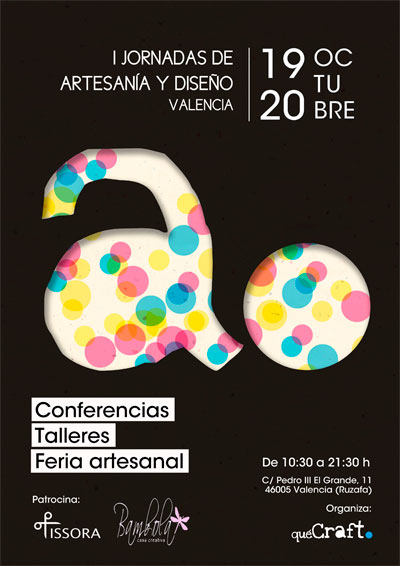 quéCraft: I Jornadas de Artesanía y Diseño Se cumple un año desde que quéCraft nació, y lo celebran con este evento que reúne conferencias, talleres, feria artesanal y otras actividades. ¿Cuándo? Fecha Del Saturday, 19 de October del 2013 al Sunday, 20 de October del 2013 HORA 00:00 h ¿Dónde? LUGAR Russafa Russafa Ver ficha La plataforma online quéCraft, diseño independiente en Valencia, organiza las I Jornadas de Artesanía y Diseño. Se cumple un año desde que esta plataforma nació, y lo celebran con este evento que reúne conferencias, talleres, feria artesanal y otras actividades. Las Jornadas de Artesanía y Diseño tienen lugar en el barrio de Ruzafa (C/ Pedro III El Grande, 11), en un amplio local con sala para conferencias, zona para realizar la feria artesanal y los talleres, y una amplia terraza que será el punto de encuentro. Programación de las I Jornadas de Artesanía y Diseño Sábado 19 de octubre 10:30 horas: Apertura de la feria artesanal. 11:00 horas: Conferencia del Centro de Artesanía de la Comunitat Valenciana. 11:00 horas: Taller “Cestos de Trapillo”. 13:00 horas: Taller “Haz tu funda del móvil”. 13:30 horas: Conferencia “Cómo enfocar tu negocio hacia las nuevas tendencias”. 17:00 horas: Conferencias “Emprender en leyes revueltas”. 17:00 horas: Taller “Tocado Tubular Flower”. 18:00 horas: Taller “Crea un monedero de piel”. 19:00 horas: Taller “Iniciación al Soutache”. 19:30 horas: Taller “WordPress es fácil si sabes cómo”. Domingo 20 de octubre 10:30 horas: Apertura de la feria artesanal. 11:00 horas: Taller “Tarjetería”. 11:30 horas: Mesa cuadrada “Mis experiencias creativas”. 11:30 horas: Tejido Social Valencia. 12:00 horas: Taller “Stamp! Un taller sin límites de creación”. 13:00 horas: Conferencia “Maneras de lanzar mi negocio online”. 13:00 horas: Taller “Mini-álbum otoño”. 17:00 horas: Taller “RE-joyero: RE-bonito, RE-elegante”. 17:30 horas: Conferencia “Designer Toy Artesanal”. 17:30 horas: Taller “Encuadernación familiar”. Los talleres tienen plazas limitadas, por lo que podéis reservar a través de la web de quéCraft (quecraftvalencia.com).