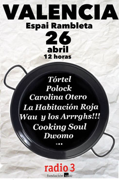 Radio3 en Espai Rambleta Programa especial desde Espai Rambleta con representantes del arte, el cine y la cultura valenciana ¿Cuándo? Fecha Del Saturday, 26 de April del 2014 al Saturday, 26 de April del 2014 HORA 12:00 h ¿Dónde? LUGAR La Rambleta Bulevar Sur esquina C/ de Pío IX Ver ficha La emisora Radio3 de Radio Nacional de España hará el 26 de abril un programa especial en directo desde el Espai Rambleta en homenaje a Valencia y su aportación a la cultura. Diferentes conciertos e invitados del arte, el cine y la cultura valenciana se darán cita desde las 12:00h y hasta las 15:00h en el Espai Rambleta. Radio3 reunirá a grupos como La Habitación Roja, Tórtel, Polock, Dwomo, Soledad Vélez, Reno, Carolina Otero o el DJ Cookin Soul son algunos de los conciertos que podrán disfrutar los presentes que acudan a Espai Rableta. La entrada para este evento en Valencia es gratuita y libre hasta completar el aforo de Espai Rambleta. Una serie de conciertos de grupos y cantantes valencianos para acercar esta emisora nacional cultural a los oyentes de Valencia. No te pierdas Radio3 en Espai Rambleta. ¿Qué hacer hoy en Valencia? Consulta más eventos en nuestra agenda. Artículos relacionados Conciertos Valencia Eventos en Valencia Primavera en Valencia