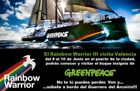 Rainbow Warrior III en Valencia El buque de Greenpeace llega a Valencia del 8 al 10 de junio ¿Cuándo? Fecha Del Sunday, 08 de June del 2014 al Tuesday, 10 de June del 2014 HORA 01:00 h ¿Dónde? LUGAR La Marina de València Muelle de la Aduana s/n Ver ficha La Marina Real Juan Carlos I recibe el domingo 8 al buque insigne de Greenpeace. El Rainbow Warrior, llega a Valencia dentro de la campaña de la organización: Prospecciones NO.Ni aquí ni allí. Durante una semana, el barco recorre Valencia, Ibiza y Mallorca para denunciar los proyectos petrolíferos que amenazan Baleares, Canarias y Valencia. Greenpeace quiere dejar claro que no es necesario más petróleo para garantizar el suministro de energía, porque es posible un modelo energético 100% sostenible y renovable. La organización ecologista apoya a la ciudadanía y a las plataformas que han levantado su voz preocupadas por las consecuencias de los planes de extracción de petróleo. Horario Entrada a puerto de Valencia: domingo 8 de junio por la mañana (hora por confirmar) Jornadas de puertas abiertas: Domingo 8 de junio: de 16:00 a 20:00 Lunes 9 de junio: de 12:00 a 14:00 y de 16:00 a 20:00 Martes 10 de junio: de 9:00 a 13:00 *Los horarios pueden sufrir cambios. No dejes de consultar qué hacer en Valencia Artículos relacionados Feria Alternativa Valencia 2014 Programación Feria Alternativa 2014