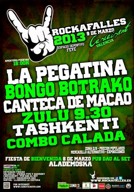 Rock a Falles 2013 Los conciertos de las Fallas 2013 prometen ¿Cuándo? Fecha Del Saturday, 09 de March del 2013 al Saturday, 09 de March del 2013 HORA 19:00 h ¿Dónde? LUGAR Recinto F.E.V.E Carcaixent Calle de Emilio Donat Ver ficha Estas Fallas de 2013 en Valencia vienen bien marchosas. El 9 de marzo tendremos el festival Rock a Falles de un día que incluye varios grupos de música muy bailable. Te contamos: La Pegatina Bongo Botrako Canteca de Macao Tashkenti Zulu 9.30 Combo Calada Los conciertos serán en el recinto F.E.V.E de Carcaixent a partir de las 19 horas. Ya puedes comprar las entradas anticipadas por 15 euros o en la taquilla el mismo día por 20 euros. Hay más conciertos en Fallas 2013. Y por si no tuvieras suficiente, consulta los conciertos en Valencia este 2013, te van a encantar. Además, estamos llenando la agenda de eventos por aquello de que en la variedad está el gusto. Estas Fallas 2013 en Valencia te lo pasarás genial. Artículos relacionados Eventos en Valencia Carreras populares en Valencia VLC Boat Show Qué hacer en Valencia Transporte Valencia Programa de Fallas 2013