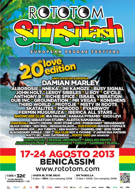 El popular festival de música reagge, Rototom Sunsplahs 2013, regresa a Benicàssim el 17 de agosto para quedarse hasta el sábado 24. En su vigésima edición, más de una veintena de artistas se subirán al escenario del recinto de Benicàssim durante los 8 días que dura el acontecimiento.