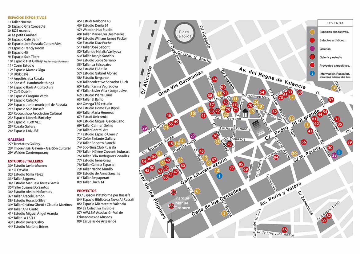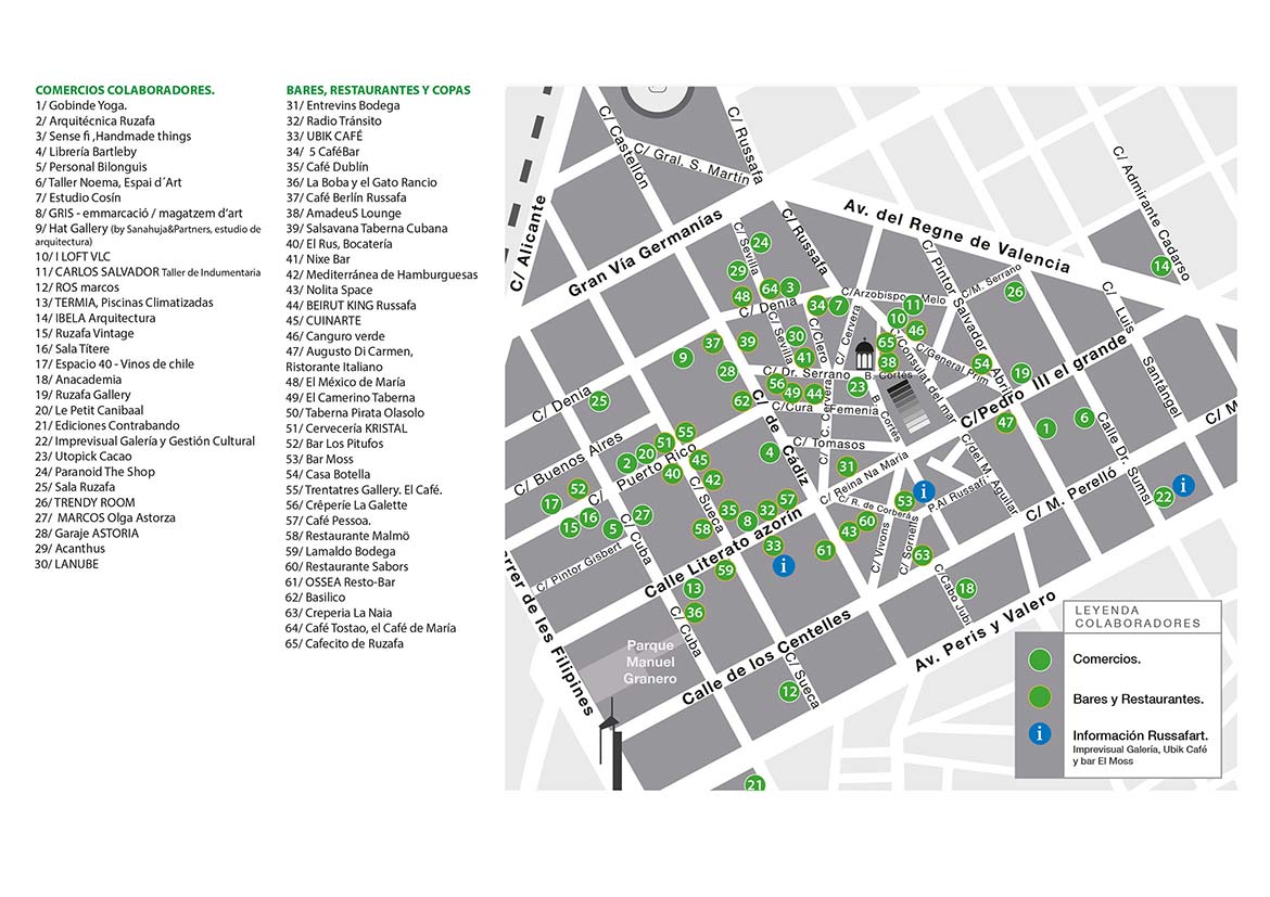 Russafart 2014 Llega Russafart 2014 bajo el lema Comunicando Arte del 30 de mayo al 1 de junio ¿Cuándo? Fecha Del Friday, 30 de May del 2014 al Sunday, 01 de June del 2014 HORA 01:00 h ¿Dónde? LUGAR Russafa Russafa Ver ficha Se celebra una nueva edición de Russafart 2014, en el barrio de Ruzafa, del viernes 30 de mayo al domingo 1 de junio. Se trata de una cita bienal que reúne a artistas y creadores del barrio, que se concentran en estas jornadas de puertas abiertas en los talleres artísticos de Ruzafa. En esta edición bajo el lema “Comunicando arte”. Russafart 2014 da a conocer el trabajo de artistas y creadores, activa la vida del barrio y refuerza y apoya el mundo del arte y la cultura de Valencia. En Russafart 2014 el arte es el protagonista y los visitantes pueden observar de cerca los espacios de creación. Lo que caracteriza a Russafart de otros eventos artísticos es la posibilidad que tiene el público de descubrir en primera persona la esencia y originalidad de lo que acontece en los talleres, algo poco común a lo que normalmente no se tiene acceso. En Russafart 2014 serán alrededor de 250 artistas entre pintores, escultores, fotógrafos y demás creadores de distintas disciplinas, los que participan en 53 estudios y 33 espacios. En esta edición de Russafart 2014 se cuenta con la participación de 10 artista brasileños de la Asociación Llave maestra de Río de Janeiro. Programa OFICIAL Martes 27 Mayo 20:30: Presentación de la Asociación Llave Maestra de Brasil, encuentro e intercambio internacional y presentación de los artistas invitados: Débora Costa, Pedro Grapiuna, Ziza Dourado, Adel Gonzaga, Lucas Reis, Gloria Marinho, Abigail Nunes, Regina Marconi a cargo de Ascensión Palacios Chanques, Presidenta de la Asociación Llave Maestra. Debate “Las experiencias y proyectos de Intercambios Internacionales” por Abigail Nunes en Ias Escuelas de Artesanos sito en la Avenida Antiguo Reino de Valencia 40, (entrada C/ Dr.Sumsi) Miércoles 28 Mayo 20:30: Presentación RUSSAFART 2014, Encuentro lúdico festivo y foto de familia con artistas participantes y amigos en UBIK CAFÉ + Performance y acción plástica a cargo de Lucía Peiró. c/ Literato Azorín 13, b. Jueves 29 Mayo 20:30: Encuentro con los artistas de la Asociación Llave Maestra de Brasil, encuentro internacional a cargo de Ascensión Palacios Chanques, Presidenta de la Asociación Llave Maestra. Debate “Abertura de los Talleres: la libertad del artista y sus desafíos” por Regina Marconi y Debate “Imagen y Sociedad: Vías afectivas y espacialidades publicas urbanas” por Ziza Dourado en Imprevisual Galería C/ Doctor Sumsi 35, b Viernes 30 Mayo 19:00: Inauguración Simultánea, Apertura de estudios, talleres y espacios expositivos,“Momento del ágape”. Hasta cierre. Sábado 31 Mayo 10:00 a 14:00 y 17:00 a 21:30 H Apertura de estudios, talleres y espacios expositivos 9:30 a 14:00 H. 3º Concurso de pintura rápida del barrio de Russafa, Artistas de todas las latitudes se suman a Russafart para plasmar en sus lienzos los rincones del barrio. Escuelas de Artesanos (Ver Bases). 11:00 a 13:00 H. Taller creativo para niños de Action painting, body art en la calle realizado por Hèléne Crecent, Ruth Zaragoza y Begoña Zornoza, en c/ Clero 6. Domingo 1 Junio 10:00 a 14:00 y 17:00 a 21:30 H Apertura de estudios, talleres y espacios expositivos 20:30 H. Entrega del premio concedido por la marca “La Pajarita”, en concepto de materiales de bellas artes equivalente al 2º premio del concurso de pintura rápida en Sporting Club Russafa c/ Sevilla 5, b 20:45 H Entrega de los premios del Concurso de Pintura Rápida Russafart 2012 de las Escuelas de Artesanos y la junta Municipal de Russafa en Sporting Club Russafa c/ Sevilla 5, b 21:00 Clausura y encuentro lúdico festivo con artistas y amigos + concierto de clausura de Julio Montalvo Collective en Sporting Club Russafa. c/ Sevilla 5, b. Restaurantes, Bares y Comercios colaboradores de RUSSAFART abren sus puertas para el disfrute de sus visitantes. Mapa de Comercios que participan en Russafart 2014 Mapa de Estudios que participan en Russafart 2014 * No dejes de asistir a esta cita cultural de Valencia. Consulta qué hacer en Valencia. Artículos relacionados Primavera en Valencia Exposiciones Valencia Eventos en Valencia
