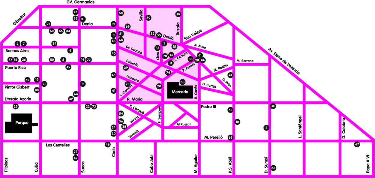 50. MADAME MIM (Puerto Rico, 30) 51. MANGIAMO (Cadiz, 21) 52. MARIETES (Sueca, 6) 53. MERCAT DE RUSSAFA (Barón de Cortés, s/n) 54. MICROTEATRE VALENCIA (Cádiz, 59) 55. MIKITA LAPENA (Denia, 6) 56. MIOBIO (Cádiz, 67) 57. MON ONCLE / OBSOLETE (Puerto Rico, 52) 58. NACHO SUMINISTROS CERÁMICOS, (Cádiz, 5) 59. PARANOID_THE SHOP (Sevilla, 7) 60. PELOJET LIGHT (Denia, 59) 61. PUFFIN TALLER DE IDEAS (Doctor Landete, 1) 62. RAQUEL CARRERO WORKSHOP / GALLERY (Pintor Gisbert, 10) 63. RESPETARTE ECOTIENDA (Martías Perelló, 9) 64. RESTAURANTE MALMÖ (Sueca, 46) 65. S’ALAT BAR I BOTIGA (Pintor Salvador Abril, 34) 66. SALA RUSSAFA (Denia, 55) 67. SABER I MÉS ESPAI EDUCATIU (Matías Perelló 54) 68. SENYORETA MAGDALENA (Cádiz, 23) 69. SLAUGHTERHOUSE (Denia, 22) 70. TALLER DE ARTES PLÁSTICAS JUANJO SANCHÍS (Clero, 1) 71. TRENTATRES GALLERY COWORKING (Denia, 62) 72. TRENTATRES GALLERY CAFÉ (Sueca, 33) 73. UBIK CAFÉ (Literato Azorín,13) 74. UTOPICK CHOCOLATES (Dr Serrano, 1 / acceso Barón de Cortés, 23) 75. ZINK! (Tomasos, 20)