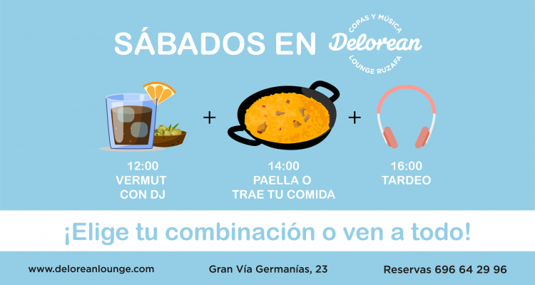 Sábado en Delorean: vermut + paella + tardeo Vermut, paella y tardeo los sábados en Delorean. ¡Un planazo! ¿Cuándo? Fecha Del Saturday, 07 de November del 2020 al Saturday, 28 de November del 2020 HORA 12:00 h ¿Dónde? LUGAR Delorean Lounge Ruzafa Gran Vía de Les Germanies, 23 Ver ficha En Delorean Lounge Ruzafa se han propuesto ofrecer el mejor planazo para los sábados, ¿por qué conformarse con ir tardeo en Valencia, si puedes aprovechar todo el día? Si buscas un plan para hacer el fin de semana, consulta nuestra agenda de Valencia: conciertos, exposiciones, teatro, rutas y eventos gratuitos. En Delorean te dan todas las opciones para que elijas tu combinación perfecta o para que vengas a todo. Consulta la programación de este local en Ruzafa: 12:00 Vermut con Dj. Será Ele Dj la encargada de amenizar el aperitivo. 14:00 Podréis comer paella +picoteo por 6€* que nos encargaremos de pedir nosotros o pedir/traeros vuestra propia comida. 16:00 Tardeo. Como cada sábado sonará pop, rock, indie y petardeo para animar la tarde de sábado. Para asegurar una mesa tanto en la terraza como en el interior del local puedes llamar al 696 642 996. *La ración de paella y picoteo son 6€ que se pagarán en el momento de la reserva. Bebida a parte. Para la paella mándanos un mensaje privado con: tu nombre + número de comensales + teléfono de contacto. IMPRESCINDIBLE reserva. La lista de reservas finalizará el viernes a las 13:00h y se requerirá de un mínimo de 15 raciones para pedir la paella. Artículos relacionados Comedy Jam en Delorean Lounge Ruzafa Valencia Hotel California-Rock Bar en València Tardeo en Delorean Lounge Ruzafa Locales para hacerte el vermut en Valencia