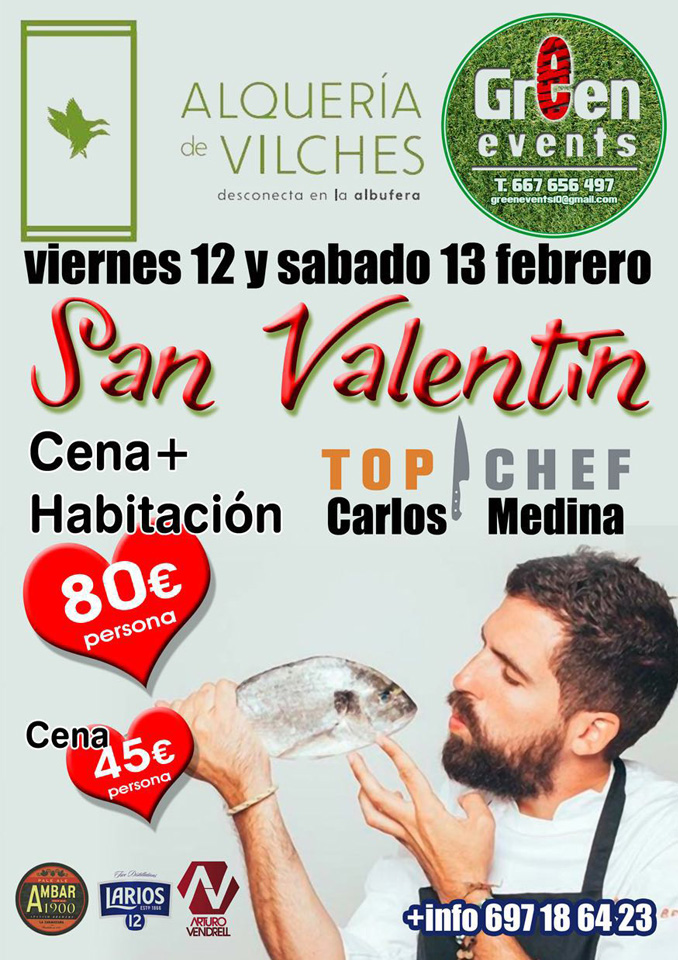 San Valentín en La Alquería de Vilches Carlos Medina concursante de Top Chef en la última edicición será el chef encargado de esta cena de San Valentín en Valencia ¿Cuándo? Fecha Del Friday, 12 de February del 2016 al Saturday, 13 de February del 2016 HORA 21:00 h ¿Dónde? LUGAR La Alquería de Vilches La Alquería de Vilches Mareny de vilches Ver ficha La Alquería de Vilches celebra con motivo del día de los enamorados los días 12 y 13 de febrero (ambos incluidos) una propuesta muy Top para disfrutar en pareja. Consulta más planes en la agenda de Valencia. Este San Valentín en Valencia sorprende a tu pareja con una escapada romántica con una cena de altura con el chef Carlos Medina, participante de la última temporada de Top Chef. La Alquería de Vilches es un hotel con encanto, antiguamente una casa de labor, en la que podrás disfrutar del paisaje típico de la huerta valenciana, del mar y del Parque Natural de la Albufera. Esta Alquería valenciana es un proyecto único y diferenciado que se caracteriza por el encanto de este entorno natural sinónimo de relax pero también de excursiones en bicicleta y largos paseos junto al mar, ideal para disfrutar en pareja este San Valentín en Valencia. Carlos Medina el concursante más creativo y polémico de la última temporada de Top Chef llega a La Alquería de Vilches dispuesto a fascinar a los asistentes con su peculiar sentido de la cocina. Menú Noche Enamorados Kimchitini Helado de BloodyMary Ostras con Kimchi con su perla reconstrucción de croqueta Thai Sopa de setas y huevo a baja temperatura Rodaballo estilo Singapur Bulgogi Pato Pekín Helado de jengibre, buzo y polvo de cacahuete picante. Después de la cena de San Valentín habrá cocteleras y la actuación del DJ Arturo Vendrell. El precio de la cena es de 45€ y si quieres incluir el alojamiento de una noche el precio es de 80€. Puedes disfrutar de esta oferta gastronómica para San Valentín la noche del viernes 12 y la noche del sábado 13. Para más información o reservas puedes ponerte en contacto en el +34 697 18 64 23.