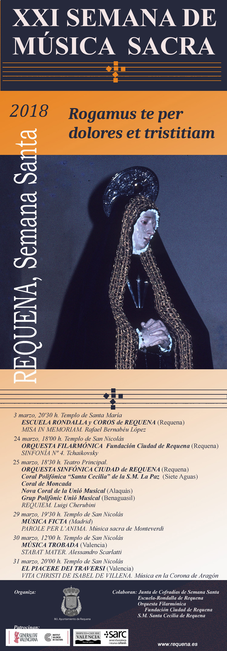 XXI Semana de Música Sacra de Requena Del 3 al 31 de marzo se celebra en Requena, la XXI Semana de Música Sacra de Requena, un festival de música sacra, único en la Comunidad Valenciana ¿Cuándo? Fecha Del Saturday, 03 de March del 2018 al Saturday, 31 de March del 2018 HORA 18:30 h ¿Dónde? LUGAR Requena Requena Ver ficha Del 3 al 31 de marzo se celebra la XXI Semana de Música Sacra de Requena, un evento de música que cada año acompaña a la festividad de la Semana Santa. Si te gusta la música y hacer turismo, no puedes dejar de visitar Requena durante el mes de marzo. En nuestra agenda de València puedes encontrar más planes para hacer en familia, con amigos o en pareja. En la Semana Santa requenense siempre ha estado presente la música como un elemento importante, tanto por los desfiles procesionales -en donde el último año se llegaron a contar 11 bandas en una misma procesión-, como por los conciertos extraordinarios de Domingo de Ramos de la Banda Sinfónica de la S.M. Santa Cecilia de Requena. La inexistencia de otros festivales de música clásica durante las fechas de la Semana Santa en la Comunidad Valenciana, junto a que ninguno de los eventos que de este estilo se desarrollan tengan como eje temático la música sacra, han convertido a la Semana de Música Sacra de Requena en un punto de referencia obligado para melómanos y aficionados. El evento organizado por el Ayuntamiento de Requena, cuenta con el patrocinio del Institut Valencià de Cultura – Generalitat Valenciana y la Diputación de Valencia. También la rancia, profunda y enraizada Semana Santa requenense y todas las manifestaciones religiosas o profanas que la componen, por su sobria y orgullosa naturaleza que le confiere un carácter único, propio y diferenciador, se ha constituido como fecha de encuentro de los requenenses ausentes, que hayan en ella una de las principales señas de identidad como pueblo. Este proyecto cuenta con la cooperación entre el Ayuntamiento de Requena y entidades religiosas locales, además de agrupaciones sociales como la Asociación de Familiares de Personas con Alzheimer que colaboran en este proyecto incluyendo sus actividades divulgativas y benéficas. El festival de música sacra cuenta con conciertos de las agrupaciones locales con formaciones de renombre nacional e internacional. Consulta el programa de la XXI Semana de Música Sacra de Requena y disfruta de la música en este municipio. Programa Semana de Música Sacra de Requena Rogamus te per dolores et tristitiam – Semana Santa 2018 3 marzo, 20’30 h. Templo de Santa María ESCUELA RONDALLA y COROS de REQUENA (Requena) MISA IN MEMORIAM. Rafael Bernabéu López 24 marzo, 18’00 h. Templo de San Nicolás ORQUESTA FILARMÓNICA Fundación Ciudad de Requena (Requena) 25 marzo, 18’30 h. Teatro Principal. ORQUESTA SINFÓNICA CIUDAD de REQUENA (Requena) Coral Polifónica “Santa Cecilia” de la S.M. La Paz (Siete Aguas) Coral de Moncada Nova Coral de la Unió Musical (Alaquàs) Grup Polifònic Unió Musical (Benaguasil) REQUIEM. Luigi Cherubini 29 marzo, 19’30 h. Templo de San Nicolás MÚSICA FICTA (Madrid) PAROLE PER L’ANIMA. Música sacra de Monteverdi 30 marzo, 12’00 h. Templo de San Nicolás MÚSICA TROBADA (Valencia) STABAT MATER. Alessandro Scarlatti 31 marzo, 20’00 h. Templo de San Nicolás EL PIACERE DEI TRAVERSI (Valencia) VITA CHRISTI DE ISABEL DE VILLENA. Música en la Corona de Aragón Cartel Semana de Música Sacra 2018 Este evento cuenta con la colaboración de Junta de Cofradías de Semana Santa, Escuela-Rondalla de Requena, Orquesta Filarmónica Fundación Ciudad de Requena y S.M. Santa Cecilia de Requena. Artículos relacionados Qué hacer en Valencia El Flea Market de Valencia Los castillos más bonitos de la Comunidad Valenciana Un día en Requena