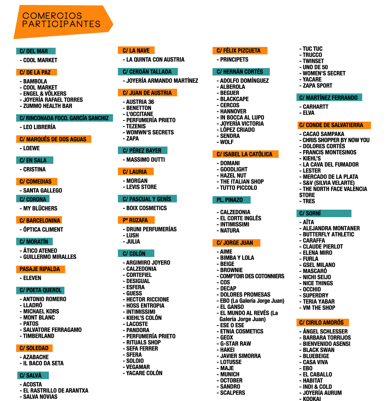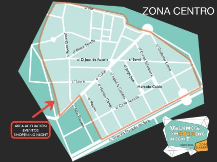 La zona comprendida entre la Calle de la Paz y Gran Vía Germanías será el centro neurálgico de la Shopening Night Verano Valencia 2014. Los entornos de Poeta Querol, Marqués de Dos Aguas, Mercado de Colón, Sorní, Jorge Juan, Colón, Hernán Cortés, Pascua y Genís y la Calle Lauria se llenarán de música, color y moda.