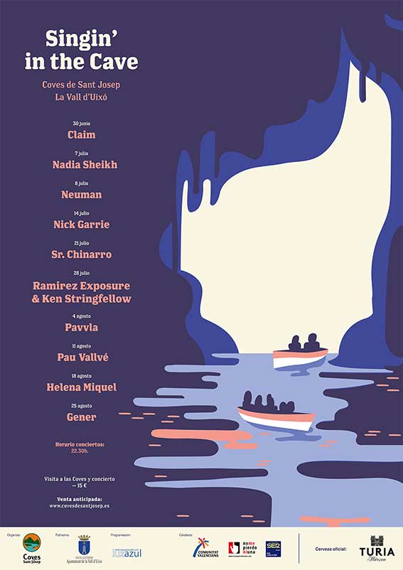 Singin’ in the cave en Les Coves de Sant Josep de la Vall D’Uixó El ciclo de conciertos Singin' in the cave se celebra en Les Coves de Sant Josep hasta el 25 de agosto ¿Cuándo? Fecha Del Friday, 30 de June del 2017 al Friday, 25 de August del 2017 HORA 21:00 h ¿Dónde? LUGAR La Vall D’Uixó La Vall D'Uixó Ver ficha Les Coves de Sant Josep de La Vall D’Uixó es uno de los lugares más especiales de la Comunidad Valenciana por su belleza y su riqueza natural. Si te hemos convencido con estos argumentos, no te puedes perder la posibilidad de ser testigo de un día en Las Grutas de San José. En su empeño por ir más allá de las visitas turísticas, este verano se ha puesto en marcha el ciclo de conciertos Singin’ in the cave que se celebra hasta el 25 de agosto.Valencia es tierra de artistas así que te damos la posibilidad de consultar toda la actividad de conciertos en Valencia u otros eventos en Valencia que te puedan resultar interesantes. Si en algo se diferencian estos conciertos tan peculiares de un concierto usual es la posibilidad única de poder visitar Les Coves de Sant Josep y disfrutar de los músicos bien cerca. Si quieres descubrir la programación de Singin’ in the cave, echa un vistazo al cartel que tienen para esta edición 2017. Las entradas se pueden adquirir vía online desde su página web www.covesdesantjosep.es. El precio de la entrada, que incluye visita a les Coves de Sant Josep y concierto, es de 15 euros y tan sólo se ponen a la venta 50 localidades por concierto; debido al aforo de la cueva. Programa Singin’ in the cave Artículos relacionados Escapadas y Excursiones en la Comunidad Valenciana 8 planes para disfrutar de agosto en Valencia Naturaleza en Valencia Festivales de música en València