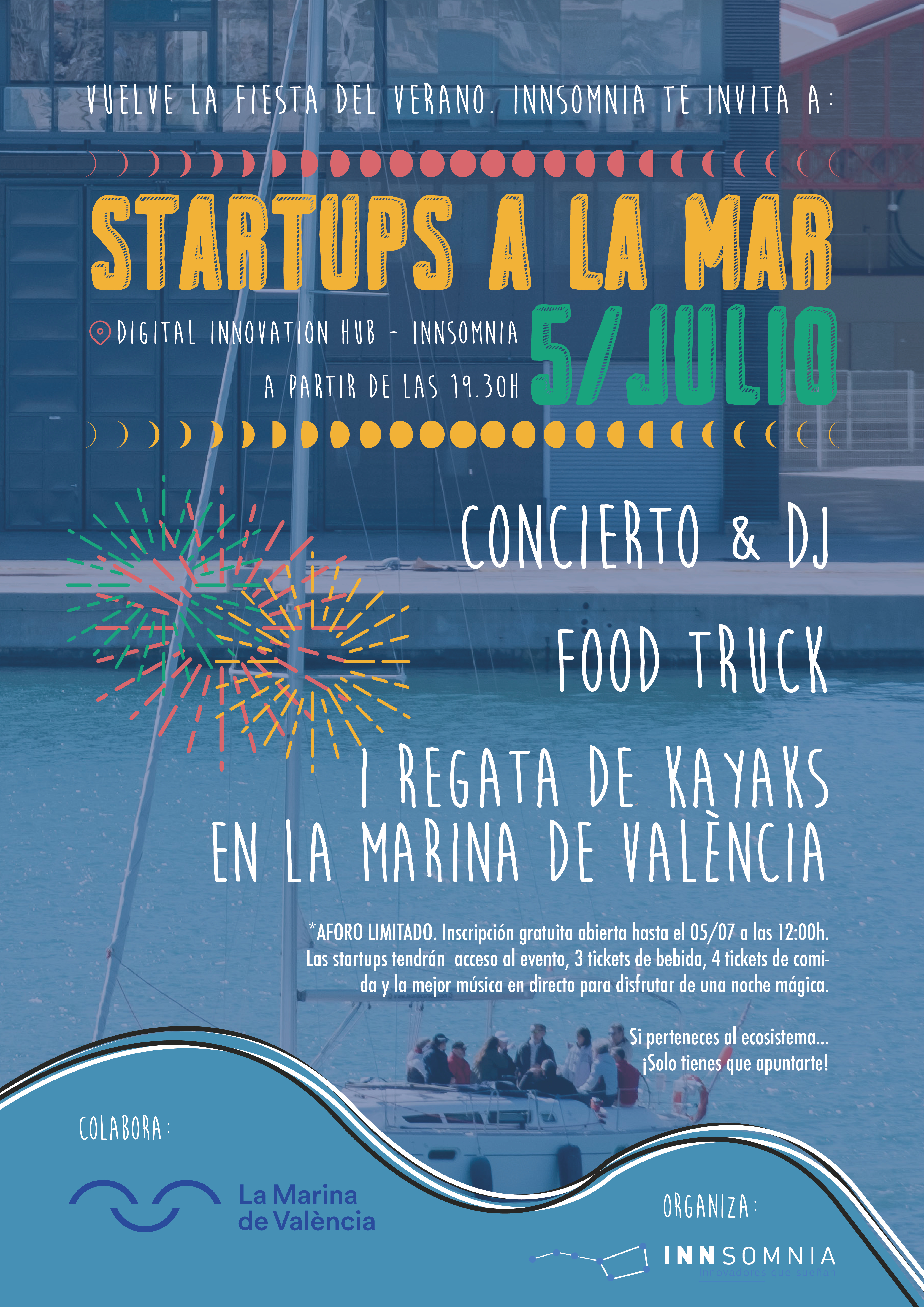 Startups a la mar en Innsomnia Disfruta de una fiesta de verano en Innsomnia con música, foodtrucks y mucho más ¿Cuándo? Fecha Del Thursday, 05 de July del 2018 al Thursday, 05 de July del 2018 HORA 19:30 h ¿Dónde? LUGAR Innsomnia Innsomnia Ver ficha Innsomnia ha organizado el 5 de julio el festival estivo Startups a la mar un día para celebrar la llegada del verano cargado de actividades. Si te interesan los eventos de la ciudad consulta nuestra agenda. A partir de las 19:30 podréis disfrutar de música en directo, gastronomía y regatas de kayacs. Podréis disfrutar del deporte, daros un baño, comer algo en los foodtruck, bailar la música de los djs o montar en kayac. Para poder acudir solo tenéis que inscribiros de forma gratuita hasta el 5 de julio a las 12:00 en ticketea. El aforo es limitado así que no te lo pienses mucho o te quedarás sin entrada. Al inscribiros os proporcionarán 3 tickets de bebida y 4 de comida. ¡No te lo pierdas! Artículos relacionados Fiestas Mayores de Picaña Fiestas patronales de Benavites Fiestas del Buen Pastor en Mislata Fiestas Patronales de Sagunto