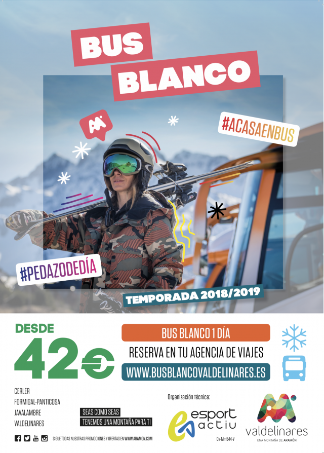 Súbete al Bus Blanco de Esport Actiu Aprende a esquiar desde cero, perfecciona la técnica o simplemente mata el gusanillo en una excursión a Valderinares ¿Cuándo? Fecha Del Thursday, 03 de January del 2019 al Sunday, 17 de March del 2019 HORA 08:00 h ¿Dónde? LUGAR Teruel Plaza de la Catedral, 1 Ver ficha Una de las mejores cosas del invierno es la nieve. En València no la vemos mucho, pero a una hora y media puedes disfrutar de ella en la estación de esquí de Valderinares. CV Activa y Esport Actiu te llevan a esquiar uno o dos días a Valderinares con el bus blanco. Un plan que mezcla deporte y naturaleza que podrás encontrar en nuestra agenda. Consúltala para no perderte nada. El bus blanco es la manera más cómoda para disfrutar de la nieve esta temporada porque te llevan y te traen y tú solo tienes que preocuparte por reservar el alquiler de esquís o la tabla y el forfait. Pero eso no es todo, los que no esquíen también pueden subirse al bus blanco sin tener que alquilar nada, solo reservar el bus y disfrutar de una día por el precioso entorno que rodea a las pistas de Valderinares haciendo muñecos de nieve, tirándote en trineo o haciendo senderismo por las montañas nevadas. Tú eliges. Las salidas son desde València y Sagunto, y hay muchos días entre semana y fines de semana para los meses de enero, febrero y marzo. Para más información y reservas entra en su web y entérate de todo. Reserva Bus Blanco Fechas y precios: Cartel: Artículos relacionados Pistas de esquí cerca de Valencia Escalada en Montanejos Rutas de senderismo por Valencia Ruta en bicicleta eléctrica de montaña