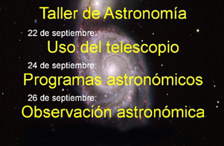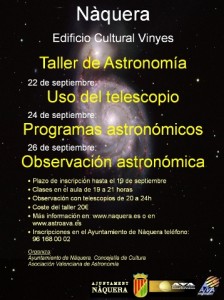 Taller de Astronomía El Ayuntamiento de Náquera y la Asociación Valenciana de Astronomía organizan un taller de Astronomía ¿Cuándo? Fecha Del Monday, 22 de September del 2014 al Friday, 26 de September del 2014 HORA 01:00 h ¿Dónde? LUGAR Valencia Valencia Ver ficha La Asociación de Astronomía de Valencia y el Ayuntamiento de Náquera organizan un nuevo taller de astronomía los días, 22 a 26 de septiembre en el Centro Cultural Vinyes. Está dirigido a personas que tienen un telescopio y quieren adquirir algunos conocimientos sobre como utilizarlo y como planificar una observación astronómica. Se trata de tres sesiones, dos teóricas y una práctica. Consulta los eventos más destacados de Valencia. Temario Utilización de los distintos elementos del telescopio. Como poner un telescopio en estación, como configurar la hora, posición, etc. como usar ese goto que se resiste. Accesorios para el telescopio. En definitiva como sacarle el mejor partido al telescopio. Programas astronómicos. El aficionado a la astronomía tiene a su alcance magníficos programas, muy adecuados para la preparación de observaciones astronómicas, que y cuando observar. Programa 22 de septiembre. Utilización de telescopios, montaje y puesta en estación, configuración del mando del telescopio, uso del sistema de búsqueda automática. Accesorios. Cálculo del aumento y del campo visual con diferentes oculares. Magnitud límite y resolución del telescopio. Se invitará a los alumnos a que lleven su telescopio para montarlo en el aula y aprender de cada uno. 24 de septiembre. Uso de programas astronómicos. Configuración del programa Cartes du Ciel. Planificación de observaciones, confección de listas de astros, eventos, obtención de datos de astros. Interpretación de efemérides astronómicas. 26 de septiembre. Observación con telescopios, puesta en práctica de los conocimientos desarrollados en el curso. Los alumnos establecerán su propio programa de observación para lo cual contarán con la ayuda de los monitores de AVA. La observación se realizará desde un lugar próximo a Nàquera. Horario Las clases en aula se darán en el Edificio Cultural Vinyes, en Nàquera, comenzarán a las 19 horas y tendrán dos horas de duración. La observación comenzará a las 20 horas y tendrá tres horas de duración. Número de plazas, matrícula El curso se dirige a 20 alumnos, está diseñado para adultos. No es necesario conocimientos previos de astronomía. A la observación podrán acudir acompañados por otros familiares de cualquier edad. AVA pondrá un telescopio a disposición de los participantes que no lo tengan. El desplazamiento al lugar de observación será por cuenta de los alumnos. En el supuesto de que el estado atmosférico impidiera la realización de la observación se ofrecerá una segunda fecha a los alumnos para realizar la observación. Inscripción El plazo de inscripción finalizará el 19 de septiembre. El coste de la matrícula es de 20€. La inscripción se realiza en el Ayuntamiento de Nàquera, teléfono: 96 168 00 02 El curso está organizado por la Concejalía de Cultura del Ayuntamiento de Nàquera y la Asociación Valenciana de Astronomía. Para más información en el Ayuntamiento de Nàquera, o en la web www.naquera.es o www.astroava.es Cartel Artículos relacionados Otoño Eventos en Valencia Exposiciones Valencia