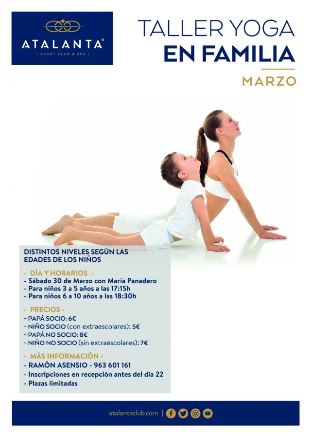 Talleres en familia Atalanta Sport Club Spa Adéntrate en el mundo del yoga con los más peques. Un plan diferente en el que los niños se lo pasarán en grande ¿Cuándo? Fecha Del Saturday, 30 de March del 2019 al Saturday, 30 de March del 2019 HORA 17:00 h ¿Dónde? LUGAR Valencia Valencia Ver ficha Atalanta Sport Club Spa te propone Talleres en Familia el próximo sábado 30 de marzo. Un plan con niños en el que podrás disfrutar del deporte con los tuyos. Si quieres conoces más planes como este, consulta nuestra agenda y no te pierdas nada. Cada mes organizan actividades diferentes, desde Yoga, Pilates, Body Balance en inglés, Cúbba, …y muchas más. Los talleres en familia de Atalanta son una forma muy divertida de hacer deporte todos los miembros de la familia: padres, tíos, abuelos y niños pueden participar en los talleres, ya que son tanto para los peques de la casa como para los adultos. Benefíciate y potencia la salud en familia. Taller yoga marzo: Día: 30 de marzo Lugar: Atalanta Ramón Asensio Hora: 17:15 (niños entre 3 y 5 años), 18:30 (niños entre 6 y 10 años) Más información e inscripciones en el siguiente botón: Reserva Talleres en Familia Artículos relacionados Fallas 2025 Spas en Valencia Planes gratis con niños en Valencia Comer con niños en València