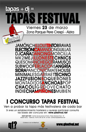 Tapas Festival El QFestival de Alzira presenta esta iniciativa que combina tapas y música DJ ¿Cuándo? Fecha Del Friday, 23 de March del 2012 al Friday, 23 de March del 2012 HORA 01:00 h ¿Dónde? LUGAR Alzira Alzira Ver ficha El Tapas Festival se encuentra integrado en el QFestival y está organizado por el Grup Què Fem, con la colaboración del Ayuntamiento de Alzira. Se celebrará en el parque Pere Crespí, donde el 23 de marzo se presentarán las tapas al público, que podrá degustarlas y votar hasta el 29. Se trata de una ruta de las tapas en la que el público podrá escuchar música DJ mientras saborea las tapas que ofrecerán diferentes bares y restaurantes alzireños. La presentación contará la actuación del grupo Furgo Rock Vand. Las tapas irán acompañadas de una bebida (cerveza, refresco o vino) y su precio no será superior a 2€. Cada tapa participará en el I Concurso Tapas Festival de Alzira. Esta actividad gastronómica recorrerá a lo largo del año todos los barrios de Alzira. Los establecimientos que deseen participar pueden informarse en la web del QFestival, donde encontrarán las bases del concurso. Artículos relacionados Tres de cada cuatro bares valencianos regalan tapas Citas gastronómicas en Valencia Concierto de David Bisbal en Alzira Conciertos Valencia Marzo 2012 QFestival Alzira Valencia 2012