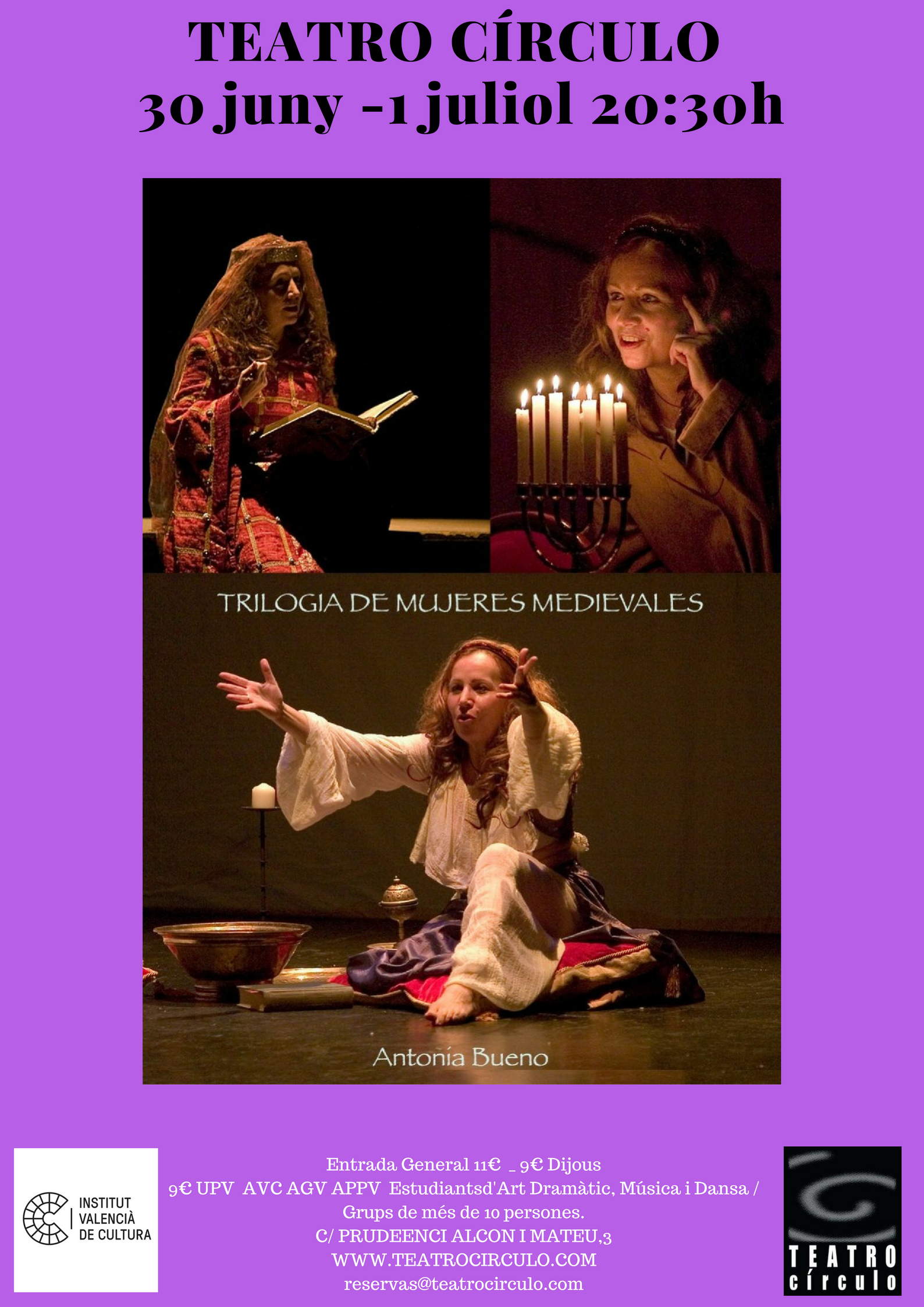 Trilogía de Mujeres Medievales en el Teatro Círculo No te pierdas las historias de tres mujeres de bandera de la antigüedad ¿Cuándo? Fecha Del Saturday, 30 de June del 2018 al Sunday, 01 de July del 2018 HORA 20:30 h ¿Dónde? LUGAR Teatro Círculo Calle Prudenci Alcon i Mateu, 3 Ver ficha El Teatro Círculo acogerá del 30 de junio al 1 de julio a las 20:30 la Trilogía de Mujeres Medievales creado por la autora valenciana Antonia Bueno. Si te interesan los eventos de la ciudad consulta nuestra agenda. El público podrá transportarte a la Hispania cristiana, a Al-Andalus musulmán y a la Sefarad judía con las tres protagonistas de la obra: Sancha, Zahra y Raquel. Sancha es una reina cristiana, la primera que tuvo el título de emperatriz. Zahra es una legendaria andalusí, favorita de Abd el Rahman III. Raquel es una sefardí. La autora ha hecho de esta obra una síntesis de tres publicaciones suyas de hace años. Nos acerca al año 1000 en la península ibérica. Además acaba de volver del Festival Internacional de teatro de la Habana con esta representación. Antonia Bueno encarna a las tres protagonistas con sus vestidos y personalidades. Ha participado en el Coloquio Internacional ‘Dramaturgias femeninas en la segunda mitad del siglo XX’ por su sorprendente trabajo con esta trilogía. Ha podido llevar a varios países y teatros estas obras en las que las mujeres dejan de estar a la sombra de los hombres de su época para contar su historia en el escenario. Estamos de celebración ya que, Antonia Bueno, acaba de ser seleccionada por el Instituto Valenciano de Cultura para formar parte del Laboratorio Dramatúrgico ‘Insula Dramataria Josep Lluís Sirera’ para escribir un nuevo texto. Artículos relacionados Faemino y Cansado en el Teatro Olympia I Want U Back en el Teatro Olympia ‘HOLLYMOOG’ en el Teatro Olympia ‘Adiós Arturo’ en el Teatro Olympia