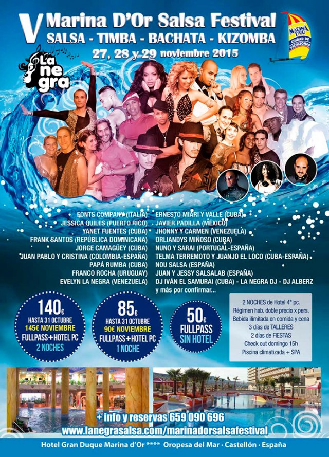 V Marina d’Or Salsa Festival ¿Cuándo? Fecha Del Friday, 27 de November del 2015 al Sunday, 29 de November del 2015 HORA 11:00 h ¿Dónde? LUGAR Marina D’Or Calle l'Antina, 3 Ver ficha Comprar entradas Marina D’Or Ciudad de Vacaciones acoge el V Festival de Salsa del 27 al 29 de noviembre en el Hotel Gran Duque Marina D’Or. Consulta más planes en la agenda de Valencia. Un gran festival de baile frente al mar mediterráneo que contará con hasta 70 grandes profesionales salseros, procedentes de diferentes países del mundo. Como todos los años, los mejores artistas del mundo compartirán talleres prácticos, fiestas y exhibiciones con todos los aficionados que se pasen por Marina D’Or durante el fin de semana. Grandes estrellas representarán a su país en la competición dónde también se realizarán talleres, fiestas con los artistas y shows. Una fiesta que no te puedes perder si te gusta el baile. El V Marina d’Or Salsa Festival se celebra del 27 al 29 de noviembre en Marina D’Or. Hay dos tipos de entradas para los que no están alojados, las entradas full pass sin alojamiento por 50€ que incluyen: 3 días de talleres, 2 días de shows de estreno y 2 noches de fiesta (2 salas, 2 ambientes) y las entradas por días sueltos (según disponibilidad) que se pueden adquirir por un precio de 30€ en la puerta del festival. Si quieres recibir más información o reservar puedes ponerte en contacto con Marina D’Or en el teléfono 659 090 696 Artistas invitados V Festival de Salsa Marina D’Or Fonts Company (Italia) Jessica Quiles (Puerto Rico) Yanet Fuentes (Cuba) Frank Santos (República Dominicana) Jorge Camagüey (Cuba) Juan Pablo y Cristina (Colombia – España) Papá Ruba (Cuba) Franco Rocha (Uruguay) Evelyn La Negra (Venezuela) Ernesto Miari y Valle (Cuba) Javier Padilla (México) Jhonny y Carmen (Venezuela) Orliandys Miñoso (Cuba) Nuno y Sarai (Portugal – España) Telma Terremoto y Juanjo El Loco (Cuba – España) Nou Salsa (España) Juan y Jessy Salsalab (Cuba) DJ Iván El Samurai (Cuba) – La Negra DJ – DJ Alberz *Seguiremos actualizando la información Artículos relacionados Otoño Arte urbano en Valencia Qué hacer con niños en València Qué ver en Valencia