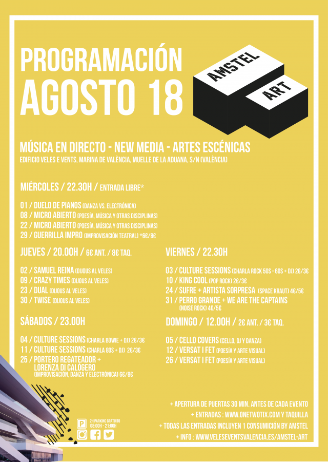 Verano en el Veles e Vents El verano llega fuerte al Veles e Vents con muchísima música, danza y artes escénicas ¿Cuándo? Fecha Del Wednesday, 01 de August del 2018 al Friday, 31 de August del 2018 HORA 12:00 h ¿Dónde? LUGAR La Marina de València Muelle de la Aduana s/n Ver ficha El Espacio Cultural Amstel Art del Veles e Vent acoge este agosto una programación cargada de música, poesía, danza y artes escénicas. Si te interesan los eventos de la ciudad consulta nuestra agenda. El buen rollo no para en el Veles e Vents, de miércoles a domingo puedes disfrutar de talentos locales de todos los estilos. Improvisaciones teatrales, arte visual, espectáculos y la mejor música en directo a orillas del mar. Los miércoles son el día de las artes escénicas y la improvisación. El 1 de agosto a las 22:30 empieza la programación con Duelo de pianos, un concierto que mezcla la música clásica con el ritmo de la electrónica. Además, habrá sesiones de micro abierto de música y poesía donde puedes participar inscribiéndote en RR.SS. Si prefieres puedes venir los jueves de tardeo que están dedicados a las bandas valencianas. En Dijous al Veles habrá grupos de música de muchos estilos, y todo empieza a las 20:00 de la tarde para que tomes algo y mientras, disfrutes del espectáculo. La propuesta más innovadora para este mes será la Culture Session, un encuentro entre músicos y expertos de los estilos más influyentes que han marcado la cultura popular, con charlas y DJ. Además, la sala situada en la planta baja del Veles e Venta ofrecerá de miércoles a domingo varios espectáculos de teatro y música con diferentes charlas. Este finde, el sábado 4 de agosto, puedes pasarte a disfrutar de la figura de David Bowie, interpretada por el guitarrista Sergio Devece a las 23:00. Eso no es todo, los domingos tienes la sesiones de aperitivo a partir de las 12:00. El 5 de agosto es turno para la música lounge de Cello covers. Este grupo mezcla danza, cello y DJ de una manera muy elegante. Si prefieres poesía Sala y Yas Olivas presenta Versat i Fet, un recital con arte visual, el 12 y el 26 de agosto. Una veintena de actuaciones se realizarán en la Sala Amstel este mes así que iremos informándote para que no te pierdas nada. Si te interesa alguno de los planes que te contamos puedes adquirir las entradas en onetwotix o en la taquilla (incluye una consumición). Si lo prefieres puedes pillarte un abono mensual para disfrutar de hasta cuatro de las actuaciones. ¡Menudo mes más movidito! Artículos relacionados Vive un verano de festival en festival Viernes de tributo en Veles e Vents Sábados de tardeo en Veles e Vents Dijous al Veles 2018 | Ciclo de conciertos en Valencia