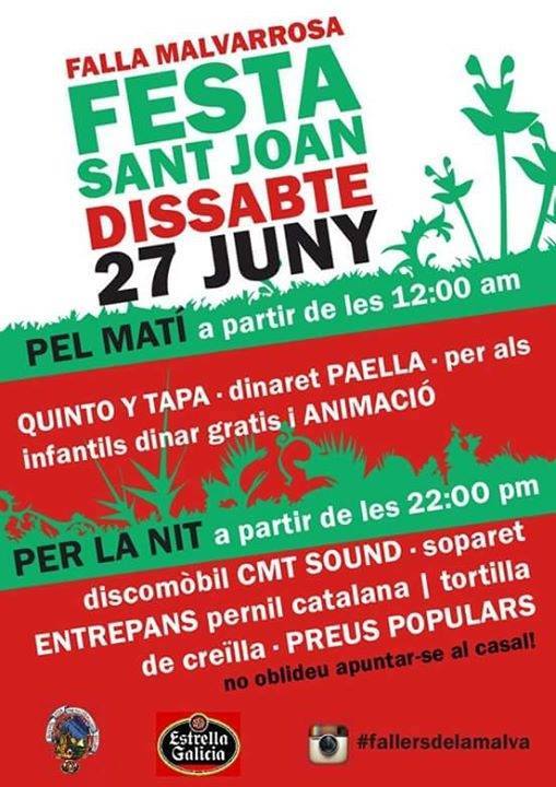 La Falla Malvarrosa no deja pasar la oportunidad de celebrar una verbena en la Noche de San Juan. El sábado 27 de junio la discomóvil CMT Sound amenizará la noche y habrá cena a precios populares también.