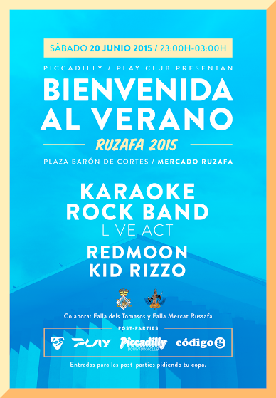 En la Plaza Barón de Cortes (Mercado de Ruzafa) la Falla dels Tomassos y la Falla Mercat Russafa han organizado el sábado 20 de junio una verbena conjunta en la que habrá un karaoke con acompañamiento en directo de una banda de rock y después pincharán los DJ’s residentes de las discotecas La3, Picadilly, Play y Código G, que colaboran en este evento.