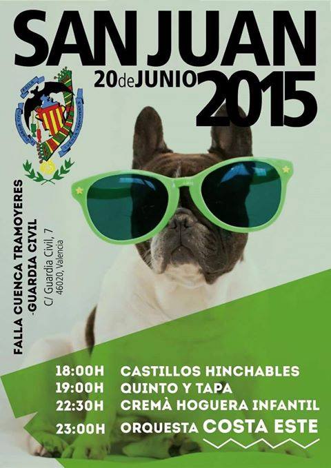 La Falla Cuenca Tramoyeres – Guardia Civil organiza, en la Calle Guardia Civil nº 7, una fiesta de San Juan el sábado 20 de junio que incluye castillos hinchables para niños y la orquesta Costa Este que amenizará la noche a partir de las 23:00h.