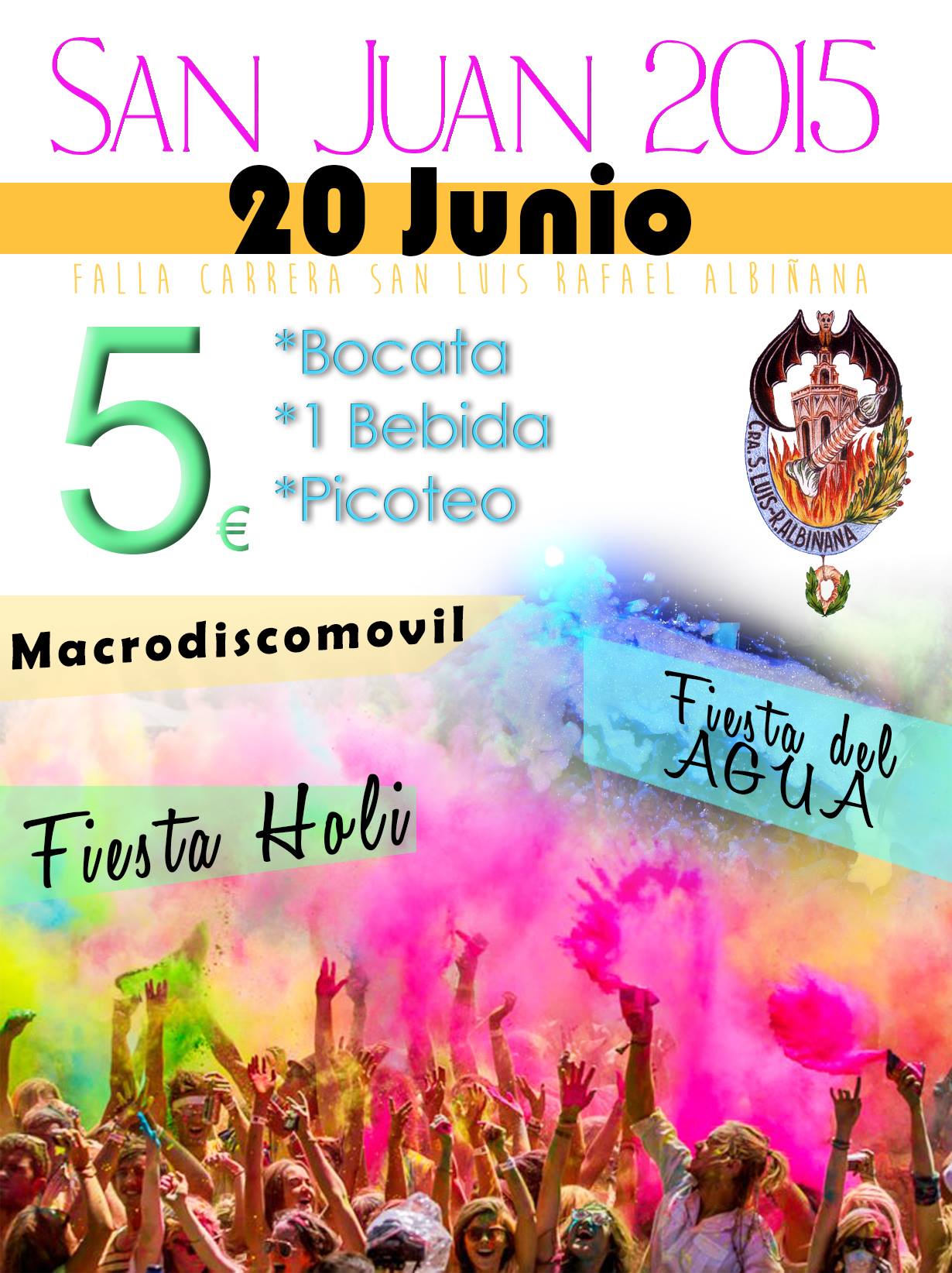 La Falla Carrera San Luis – Rafael Albiñana tiene preparada una macrodiscomóvil a partir de las 23:00h que acompañará una Fiesta del Agua y una Fiesta Holi. ¡No te lo puedes perder! Esta verbena de San Juan 2015 se celebrará el 20 de junio y está situada en la Calle Carrera Fuente de San Luís número 113.