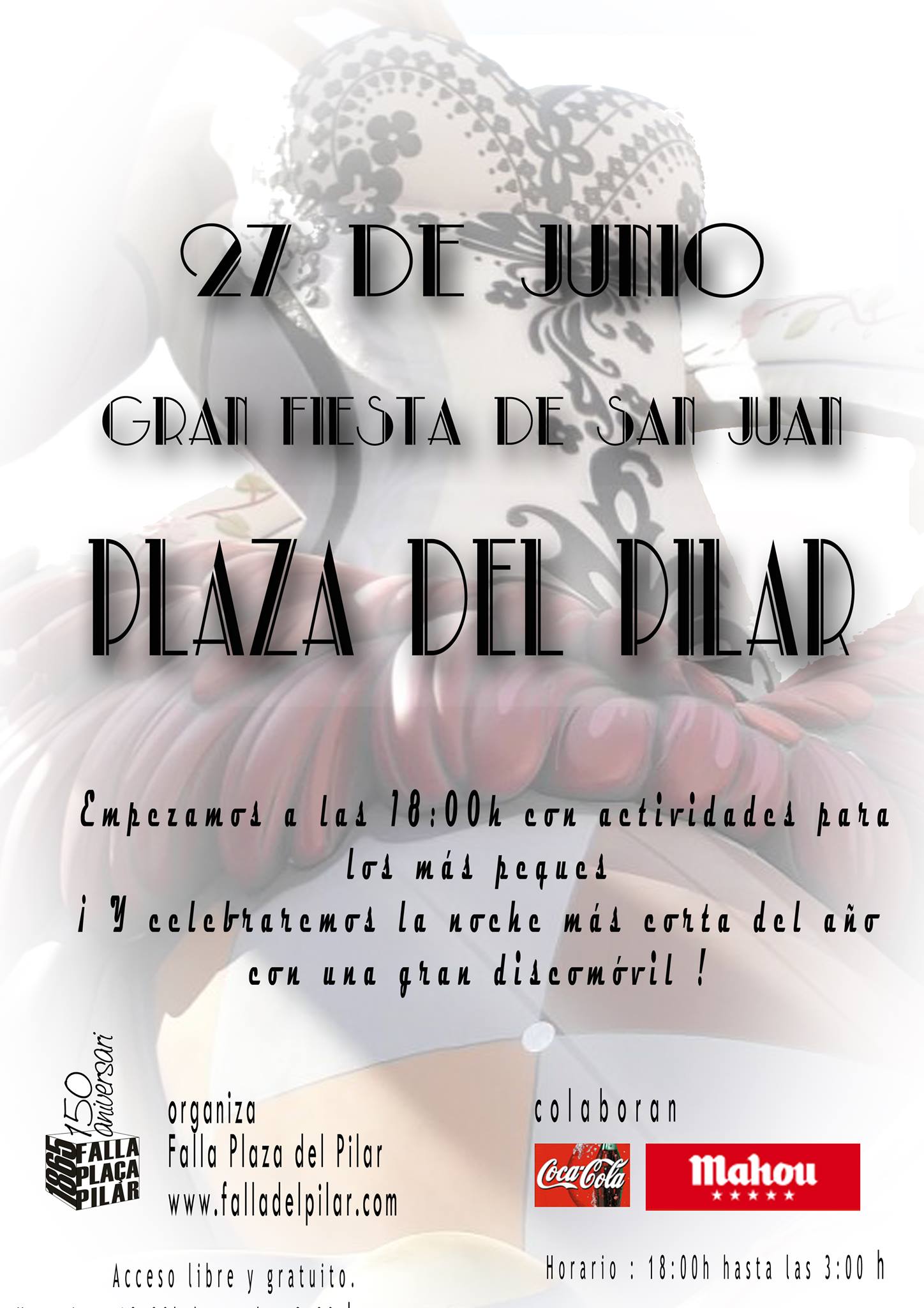 En la Plaza del Pilar habrá montada una buena fiesta gracias a la Falla Plaza del Pilar, que el 27 de junio empezará a las 18:00h con actividades para niños y seguirá por la noche con una discomóvil hasta las 3 de la mañana.