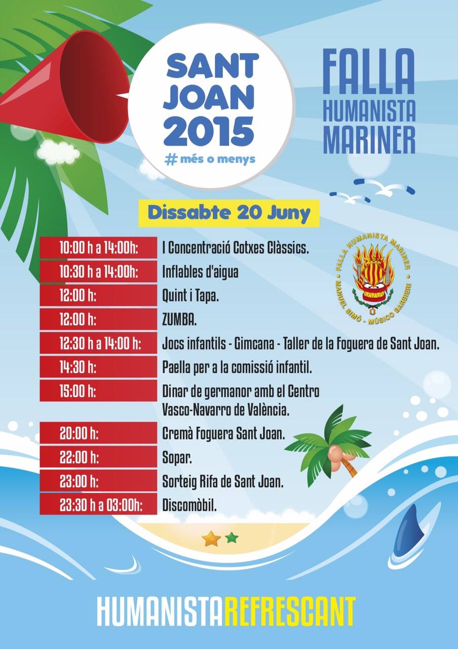 La Falla Humanista Mariner organiza el sábado 20 de junio en el Parque Oeste (cerca de la Avenida del Cid) unas fiestas de San Juan muy completas en las que por la mañana habrá una concentración de coches clásicos y juegos infantiles, por la tarde se quemará la hoguera de San Juan y por la noche habrá discomóvil hasta las 3:00h de la mañana.
