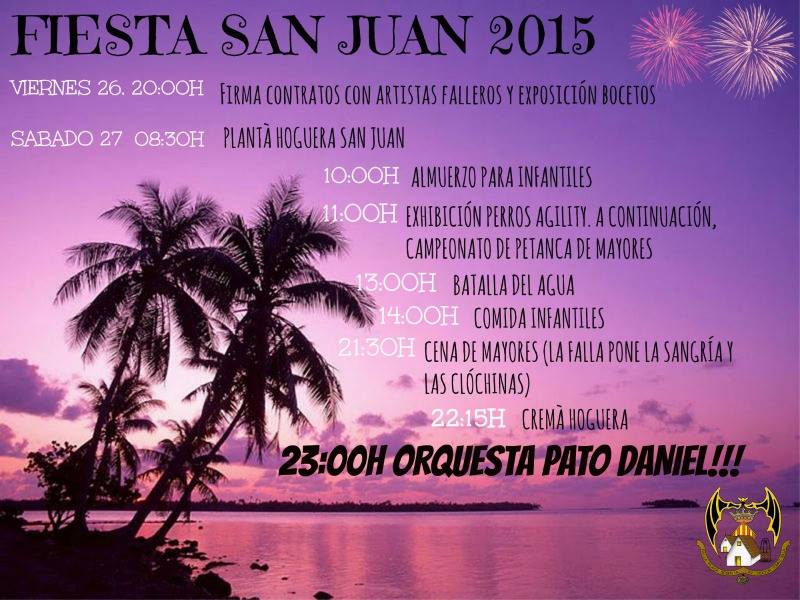La Playa de la Patacona no podía quedarse sin sus fiestas de San Juan 2015 y este año han organizado un fin de semana lleno de actividades el 20 y el 21 de junio en el que la música no fallará, ya que habrá una discomóvil los dos días a partir de las 23:30h. La Falla Platja Patacona – Camí de Vera participará en las fiestas organizando un playback infantil el sábado a las 20:00h. Disfruta de las Fiestas de la Patacona 2015.