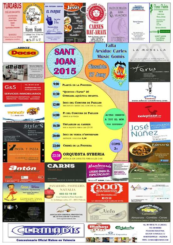 La Falla Archiduque Carlos-Músico Gomis trae la Orquesta Syberia el sábado 27 de junio a partir de las 22:30h, con copas a 3 euros. Durante el día, habrá concurso de paellas, hinchables para niños y más actividades para que pequeños y mayores disfruten de las Fiestas de San Juan 2015.