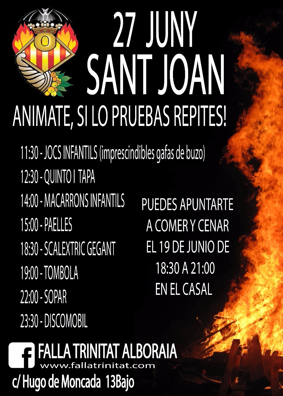 La Falla Trinidad Alboraya, situada en la Calle Hugo Montcada 13, celebra la Noche de San Juan el 27 de junio con muchas actividades para pequeños y mayores. A las 11:00h se montará la hoguera de San Juan con la ayuda de la Comisión Infantil y a partir de ahí habrá todo tipo de eventos hasta culminar en la discomóvil, que se alargará hasta las 3 de la mañana.