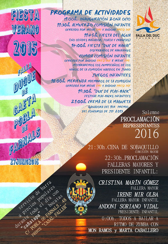 La Falla Duque de Gaeta Puebla de Farnals organiza un gran número de actividades para dar la bienvenida la verano 2015 a lo largo del sábado 27 de junio. Por la noche a las 00:00 h. todos a bailar a ritmo de zumba con Mon Ramos y Marta Caballero