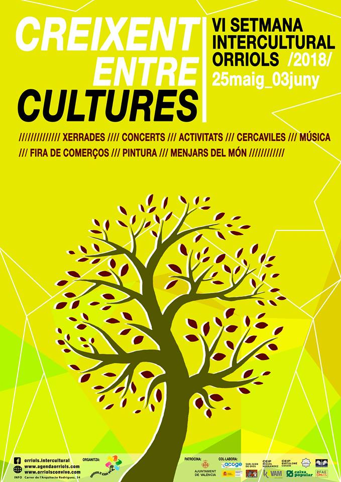VI Semana Intercultural de Orriols Disfruta de una semana de cultura en el barrio de Orriols, del 25 de mayo al 2 de junio ¿Cuándo? Fecha Del Friday, 25 de May del 2018 al Saturday, 02 de June del 2018 HORA 18:00 h ¿Dónde? LUGAR Valencia Valencia Ver ficha Del 25 de mayo al 2 de junio, Orriols Convive junto a asociaciones y entidades del barrio celebran la VI Semana Intercultural de Orriols. No dudes en consultar nuestra agenda para no perderte nada que hacer en València. La VI Semana Intercultural de Orriols es una iniciativa que llena de conciertos, charlas y comida las calles de Orriols. Bajo el lema “Creixent entre cultures”, esta edición acerca al ciudadano a todo tipo de actividades que giran en torno al respeto y el descubrimiento de nuevas culturas. Por ejemplo, encontramos charlas sobre Palestina, Camerún o el pueblo gitano. Así como conciertos de bandas variadas como L’Horta Soul, L’Horta en Flama o Luna de África. Consulta el botón de programación para conocer los horarios y actos preparados en detalle: Programación Semana Intercultural de Orriols No lo dudes y pásate por esta gran fiesta que estará en el barrio de Orriols toda una semana, del 25 de mayo al 2 de junio. Cartel VI Semana Intercultural de Orriols Artículos relacionados Cine valenciano al aire libre Valencia gratis Agenda de eventos gastronómicos en Valencia Ciclo de conciertos “Distrito Sonoro” en València