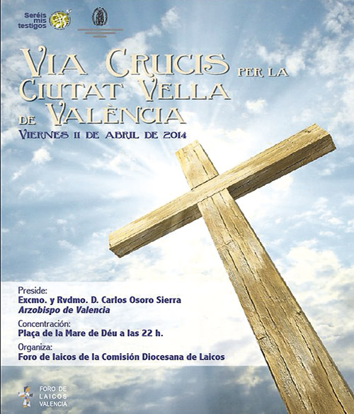 Via Crucis per Ciutat VellaEl Arzobispo de Valencia, monseñor Carlos Osoro, presidirá el Via Crucis 2014 que tiene el siguiente recorrido: salida desde la plaza de la Virgen y paso por calle del Miguelete, plaza de la Reina, calle del Mar y calle Avellanas para concluir delante del Arzobispado.