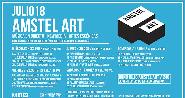 Viernes de tributo en Veles e Vents Disfruta de los clásicos de la música y los homenajes más entretenidos los viernes de julio ¿Cuándo? Fecha Del Saturday, 07 de July del 2018 al Friday, 27 de July del 2018 HORA 22:30 h ¿Dónde? LUGAR La Marina de València Muelle de la Aduana s/n Ver ficha La Sala Amstel Art del Veles e Vents acoge el ciclo Viernes Tributo este mes a partir de las 22:30. Si te interesan los eventos de la ciudad consulta nuestra agenda. Si no tienes plan los viernes de el mes de julio puedes acudir a disfrutar de los tributos de la Sala Amstel. Podrás deleitarte con la música de Luis Miguel, el homenaje a Alejandro Fernández o Alejandro Sanz. Programación 7 de julio Penja’m Peja’m es un proyecto artístico con varias disciplinas que quieran mezclar la música electroacústica con la danza y lo audiovisual, se trata de jam session. 13 de julio Canta por Luis Miguel Luis Miguel actuará en La Marina Sur de Valencia por lo que a modo de homenaje se celebrará esta fiesta donde el público podrá bailar sus temas míticos. 20 de julio Homenaje a Alejandro Fernández con actuación de Ropa Vieja Los tres músicos relevantes de la ciudad unen su arte atreviéndose a cantar los clásicos boleros y rancheras con un toque swing. 27 de julio Homenaje a Alejandro Sanz con actuación de Mike Martín Mike Martín tiene un largo recorrido desde que empezó en el Conservatorio Jacinto Guerrero obteniendo las mejores calificaciones en piano y música de cámara. Artículos relacionados Conciertos en el Monasterio de Sant Jeroni de Cotalba Concierto de Revólver en el Palau de la Música Concierto de Vetusta Morla en las Artes y las Ciencias Bomba Estéreo y Zoé en los Conciertos de Viveros 2018