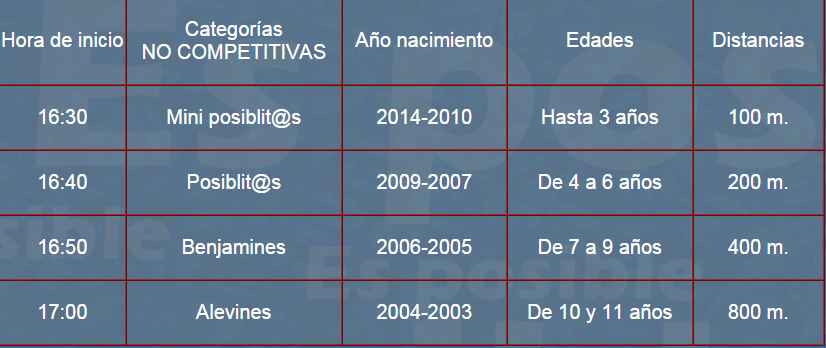 Vuelta a Pie Infantil “Es Posible” El sábado 29 de noviembre se celebra esta actividad deportiva dirigida a los menores de 12 años ¿Cuándo? Fecha Del Saturday, 29 de November del 2014 al Saturday, 29 de November del 2014 HORA 16:30 h ¿Dónde? LUGAR Valencia Valencia Ver ficha El sábado 29 de noviembre se celebra en Valencia, con motivo de la actividad complementaria a la XIV Vuelta a Pie “Es Posible” Grupo Marina, la Vuelta a Pie Infantil “Es Posible“. Se trata de un evento deportivo en Valencia, dirigido a los menores de 12 años. Descubre toda la agenda de actividades para niños en Valencia. Vuelta a Pie Infantil “Es Posible” Para los menores de 12 años se ha creado este evento deportivo la tarde anterior a la XIV Vuelta a Pie “Es Posible” Grupo Marina. Ya está disponible en enlace para poder inscribirse a esta carrera infantil que cuenta con un máximo de 1000 participantes. El día de la carrera, los menores deberán ir acompañados por un adulto (representante legal del menor) y llevar una autorización firmada por estos, para que los niños puedan participar. Detalles de inscripción Como actividades complementarias a esta carrera para niños, a las 16:00 y a las 17:15 habrá un cuentacuentos, y también Los Reyes Magos y sus pajes recogerán las cartas para los Reyes Magos. Pruebas Según la edad, los niños se dividen por categorías. Cada categoría comienza la carrera en un horario diferente. A continuación se encuentra toda la información al respecto de esta Vuelta a Pie Infantil “Es Posible“. Horario y lugar La carrera tiene lugar el sábado 29 de noviembre a las 16:30 en Valencia. El inicio es en la Calle La Safor (cerca de las Cortes Valencianas). ¡Disfruta de esta actividad deportiva para niños en Valencia! Artículos relacionados Rutas para correr en Valencia Qué hacer con niños en València Eventos deportivos en Valencia