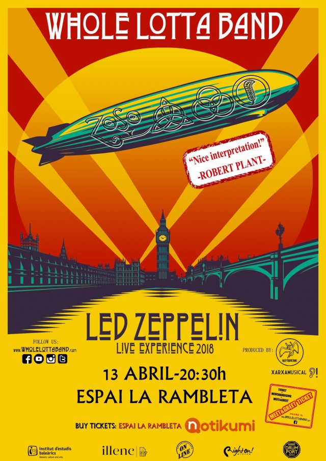 Whole Lotta Band, Led Zeppelin Experience en Valencia Llega a Valencia el más fiel homenaje a Led Zeppelin con el concierto de Whole Lotta Band ¿Cuándo? Fecha Del Friday, 13 de April del 2018 al Friday, 13 de April del 2018 HORA 21:00 h ¿Dónde? LUGAR La Rambleta Bulevar Sur esquina C/ de Pío IX Ver ficha Comprar entradas La Rambleta acoge el próximo viernes 13 de abril a las 21:00h un concierto en Valencia en forma de tributo, Whole Lotta Band, Led Zeppelin Experience. En primavera es imposible quedarse sin plan. Consulta nuestra agenda y descubre los mejores eventos: teatro, exposiciones, rutas, conciertos y actividades gratuitas. Whole Lotta Band, formada por cuatro grandes talentos de la música, tiene como objetivo hacer que sus conciertos se conviertan en una reedición de los conciertos que llenaron estadios en la década de los 70. Para ello, no dudan en rodearse de todos los elementos necesarios para tener la puesta en escena más potente de los últimos tiempos: Guitarras de doble mástil, batería naranja transparente, theremín, arco de violín, teclado, hammons, luces, audiovisuales, etc. . . ¡Un gran espectáculo que no te puedes perder! La esencia de Led Zeppelin vuelve a nacer en pleno siglo XXI, nace WHOLE LOTTA BAND. Puedes comprar tu entrada en el botón que hay debajo del mapa. La venta anticipada tiene un precio de 18€ por persona, mientras que el mismo día del concierto, las entradas valen 20€ en la taquilla de La Rambleta. *La apertura de puertas es a las 20:30h. Cartel concierto Whole Lotta Band Artículos relacionados Carrera de la Mujer 2023 en València El Flea Market de Valencia Festival Dansa València 2018: Elles es mouen Concierto de la Joven Banda y Orquesta Americana en València
