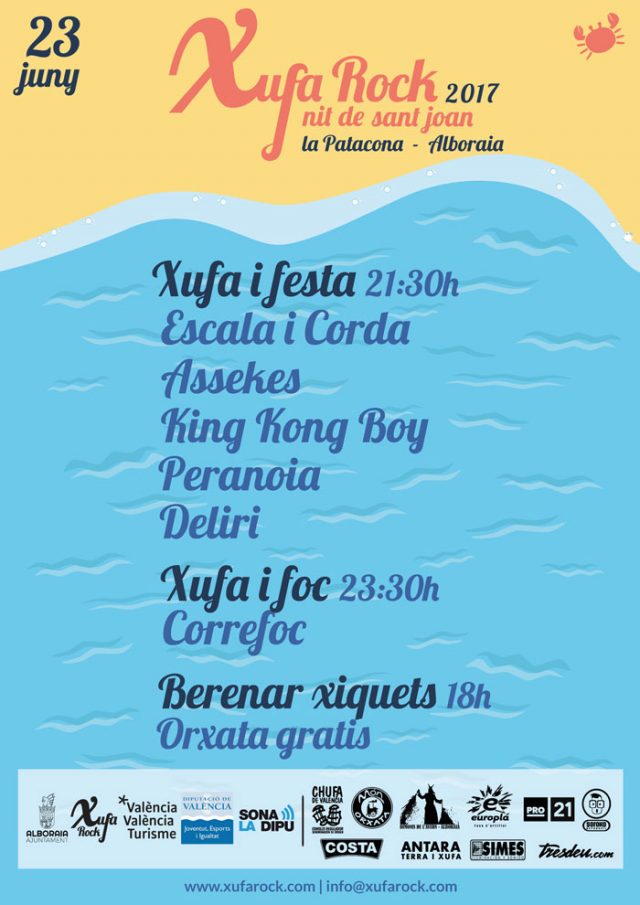 Xufa Rock en San Juan Fiesta en Patacona para la noche de San Juan en Valencia ¿Cuándo? Fecha Del Friday, 23 de June del 2017 al Friday, 23 de June del 2017 HORA 18:30 h ¿Dónde? LUGAR Playa de la Patacona Pº Marítimo de la Patacona, 43, Ver ficha La noche de San Juan en Valencia es uno de los eventos más esperados de la ciudad. La noche más mágica y corta del año anima a cientos de vecinos y visitantes a disfrutar de las propuestas de ocio que surgen. Es por ello que muchas fiestas y verbenas de la noche de San Juan se organizan en estas fechas. Una de las propuestas más aclamadas para la noche de San Juan es el festival Xufa Rock en la playa de la Patacona, en Alboraya, y este 2017 llega con nueva edición. El viernes 23 de junio dará comienzo, a las 18.00 horas en el edificio singular del paso de la Patacona (Alboraya), este festival con una merienda infantil y horchata gratis. Más tarde, a las 21:30 horas comenzará la fiesta para los adultos con grupos como Deliri, King Kong Boy, Escala i Corda, entre otros. La nota pirotécnica será a las 23:30 horas con el Correfoc, a cargo de la colla ”Dimonis de l’Avern” con la colaboración de pirotecnia Europla, que encenderá con fuego la noche de San Jua nen Valencia. Y, como siempre, a las 00.00 no olvides realizar alguno de los rituales para la noche de San Juan. Cartel Xufa Rock noche de San Juan 2017 Artículos relacionados Verano Feria de Julio 2019 Cine de verano en València Noche de San Juan 2019