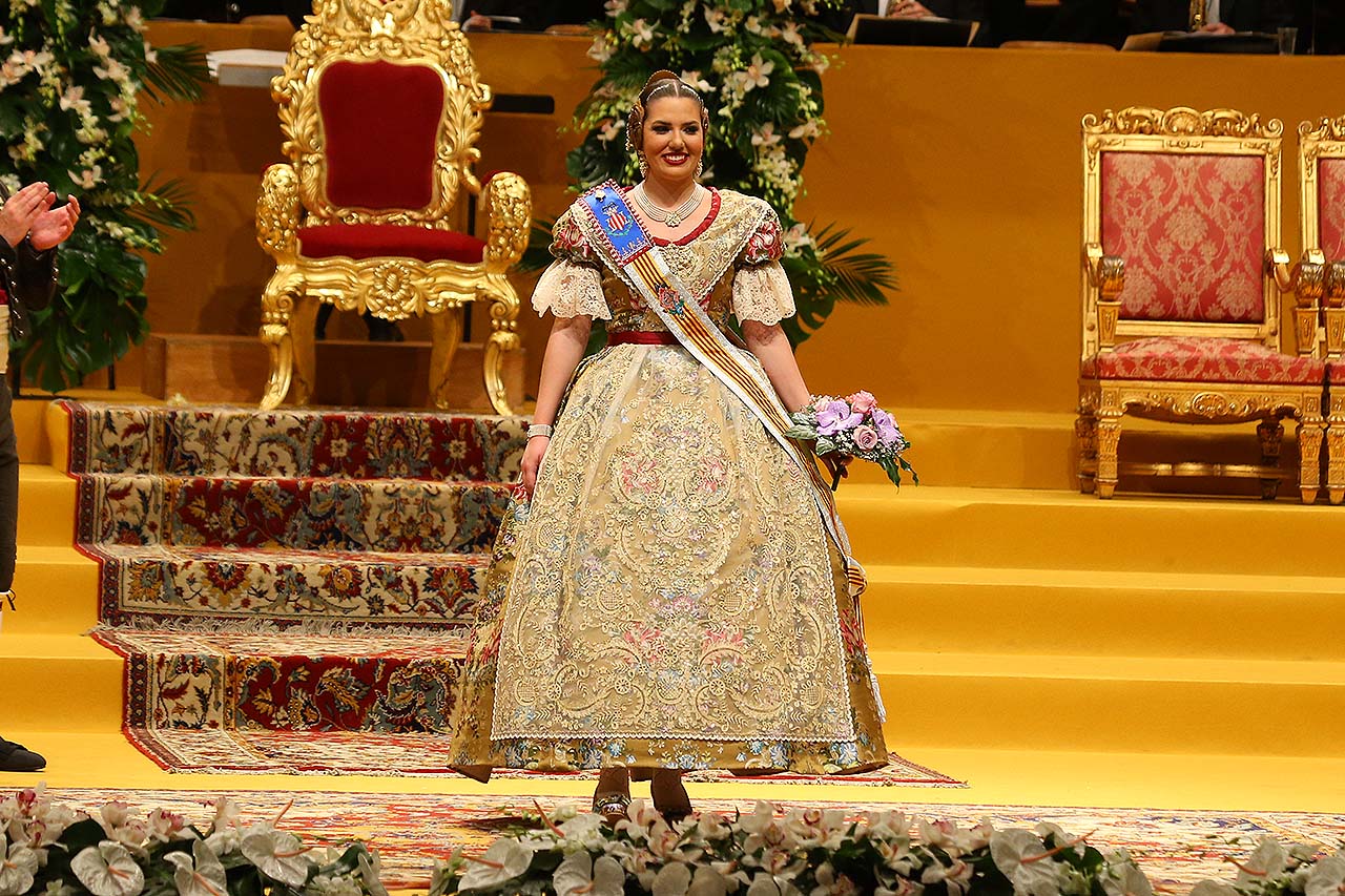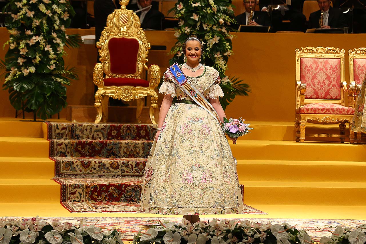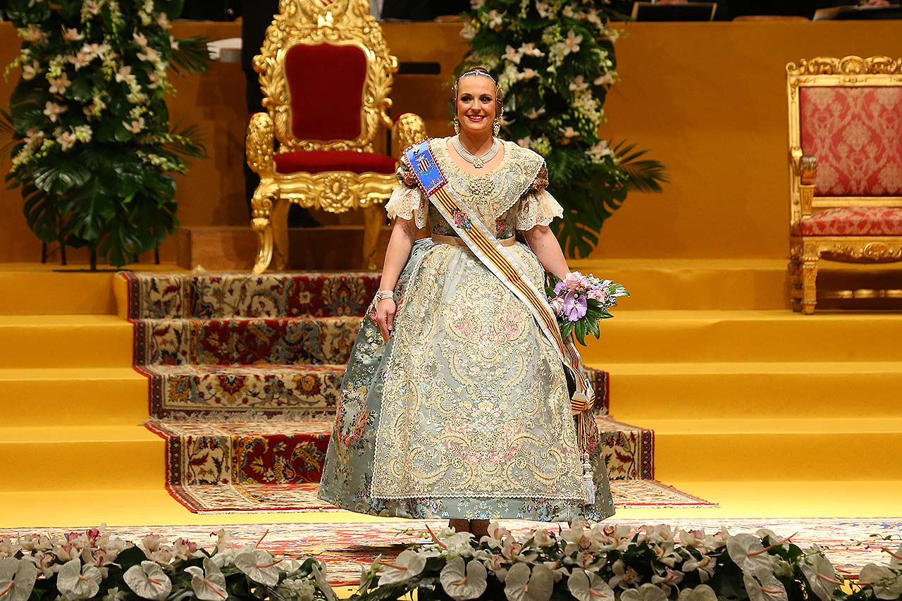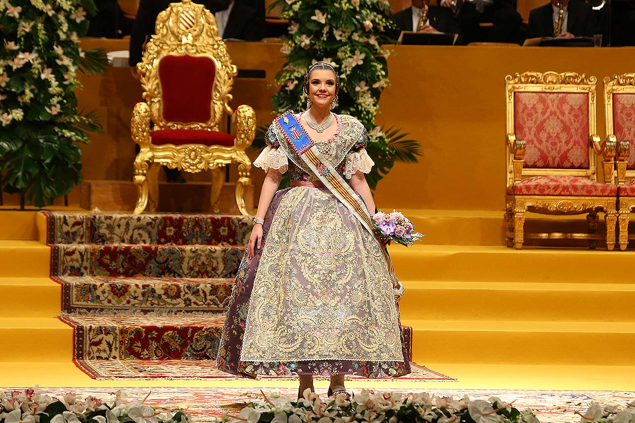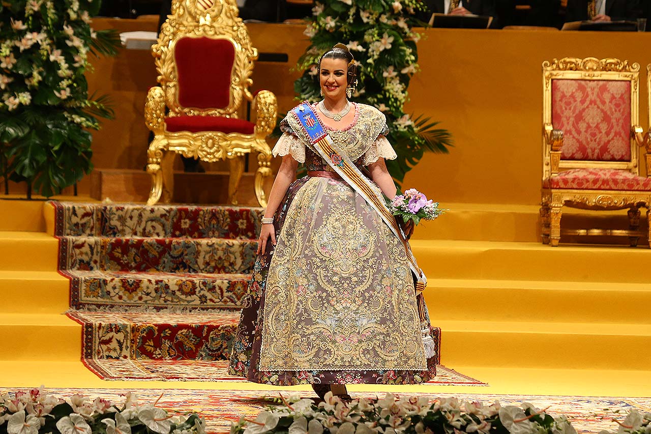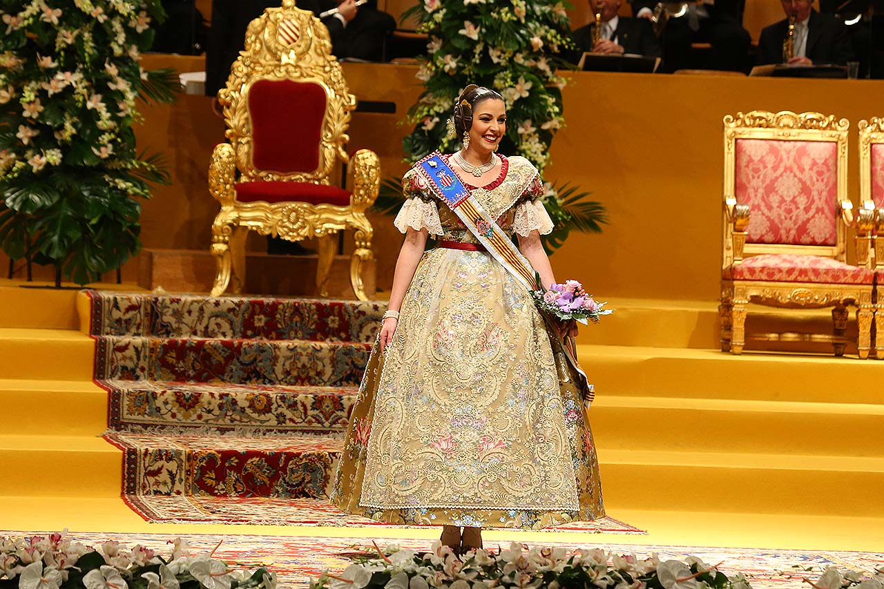 Exaltación de las Falleras Mayores 2018 Los días 26 y 27 de enero de 2018 tuvo lugar la Exaltación de las Falleras Mayores de Valencia en el Palau de la Música, con espectáculo pirotécnico al acabar cada acto. Los días viernes 26 y sábado 27 de enero de 2018 Valencia ha celebrado unos de los actos previos más importantes a estas Fallas 2018: la Exaltación de las Falleras Mayores 2018. No dejes de consultar el Programa de Fallas 2018 y entérate de todo lo que acontece la fiesta fallera. Hay un día reservado para cada Fallera Mayor de Valencia. Por una parte el día viernes 26 de enero a las 21:30h tuvo lugar la Solemne Exaltación de la Fallera Mayor de Valencia Srta. Rocío Gil Uncio y su Corte de Honor 2018. El acto tuvo lugar en el Palau de la Música de Valencia. Al finalizar la Exaltación, hubo un espectáculo pirotécnico con efectos de luz y color. El día siguiente, sábado 27 de enero de 2018, a las 18:00 horas tuvo lugar la Solemne Exaltación de la Fallera Mayor Infantil de Valencia niña Daniela Gómez de los Ángeles y su Corte de Honor Infantil 2018. De nuevo el acto se celebró en el Palau de la Música, y al finalizar la Exaltación se contó con otro espectáculo pirotécnico lleno de color y luces. Con ocasión de la Exaltación, Vives y Marí tejió el espolín que la fallera mayor Rocío Gil Uncio lució en el acto. El espolín ha sido tejido manualmente en tres turnos de trabajo y se han empleado unas 650 horas aproximadamente. La confección del traje ha corrido a cargo de Eugenia Puertes y para el color de fondo se ha elegido el Habane, una tonalidad de marrón con mucha elegancia que se ha combinado con diferentes oros consiguiendo una tela dulce y personal. Daniela Gómez de los Ángeles, la Fallera Mayor Infantil de València, ha llevado en su Exaltación un espolín en tono azul turquí de la firma Garín y confeccionado por La Joia. Galería de imágenes Corte de Honor 2018 Corte de Honor Infantil 2018 Disfruta de la gran fiesta de Valencia y conoce las Falleras Mayores 2018. Consulta toda la agenda de Valencia y qué hacer en invierno en Valencia.