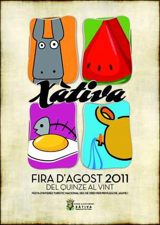 Fira d’Agost 2011 Xàtiva Las Fiestas de Agosto 2011 de Xàtiva se celebran del 1 al 20 de agosto La Fira d’Agost 2011 Xàtiva se celebra del 1 al 20 de agosto. Xàtiva es una ciudad de la provincia de Valencia, una de las más importantes. Durante agosto se celebran sus fiestas: actividades populares, conciertos y diversos campeonatos. Consulta sus festejos. Programación 1 de agosto 08:00 horas. Missa a l’ermita de Sant Feliu. 10:00 horas. XXXII Edició del torneig internacional de tenis Orysol. 2 de agosto 10:00 horas. XXXII Edició del torneig internacional de tenis Orysol. 3 de agosto 10:00 horas. XXXII Edició del torneig internacional de tenis Orysol. 4 de agosto 10:00 horas. XXXII Edició del torneig internacional de tenis Orysol. 22:30 horas. Concert a la Mare de Déu de la Seu. Societat Musical La Primitiva Setabense Plaça de La Seu. 0:00 horas. Ronda a la Mare de Déu de la Seu a la pl. de la Seu. 5 de agosto 08:00 horas. Missa la Mare de Déu de la Seu en la Basílica de la Seu. 10:00 horas. XXXII Edició del torneig internacional de tenis Orysol. 20:00 horas. Processó general pels carrers de volta. 6 de agosto 17:00 horas. XXXII Edició del torneig internacional de tenis Orysol. 7 de agosto 09:30 horas Trofeu de pesca Fira de Xàtiva Cañasport al riu Xúquer Zona Fortaleny y Trofeu de pesca Fira d’agost al riu Xúquer Zona Fortaleny. 10:00 horas IV Concentració de motos Fira d’agost de Xàtiva. A l’estació d’autobusos. 17:00 horas XXXII Edició del torneig internacional de tenis Orysol. 13 de agosto 22:30 horas. Gran Concurs d’emboladors Presentació del bou “Raton” Organitza: Taurosur SL Plaça de Bous de Xàtiva. 14 de agosto 09:30 horas. Concurs de tir olímpic Fira d’agost 2011 al camp de tir La Costera. 19:30 horas. Sensacional correguda de bous amb Vicente Barrera, Francisco José Palazón i Alejandro Esplá. 20:00 horas. XXVI Open Frontenis Fira d’Agost. Al club Sant Patrici 22:30 horas. Acte de nomenament oficial de Maria Peris Mateu com a reina de la Fira d’agost 2011 i de la seua cort d’honor. Tot seguit, tindrà lloc l’espectacle d’inauguració de la Fira d’agost 2011. Enguany comptem amb l’actuació de l’artista Antonio Carmona. Per a finalitzar l’acte es dispararà un castell de focs artificials. 02:00 horas.Nit de cant d’Albades amb els “Xirimiters i Cantaors” de Xàtiva. Pl. de Sant Pere i contornada. 15 de agosto 10:00 horas. XXXVII Concurs de tir i arrossegament. 10:00 horas. Motociclisme 60 trofeu de velocitat Fira d’agost al circuit urbà, amb eixida i meta en l’av. República Argentina. 10:00 horas. Gran simultània d’escacs a 25 taulers al Reial de la Fira. 12:00 horas. Inauguració exposició de fotografia a la Casa de Cultura, Sala d’Exposicions. 12:30 horas. Inauguració exposició de pintura Fira d’agost 2011 a la Sala d’exposicions Moncada. 14:00 horas. Gran mascletà al jardí de la Pau. 17:00 horas. XXXVII Concurs de tir i arrossegament. 19:30 horas. Espectacle infantil Cia. l’Esclat presenta Pataclown a la glorieta José Espejo. 20:00 horas. XXVI Open frontenis Fira d’Agost al club Sant Patricio. 21:00 horas. Sopar dels jubilats i pensionistes amentitzat amb l’orquestra Zherezade al camp de futbol la Murta. 22:30 horas. Gran concurs nacional de retalladors a la pl. de bous de Xàtiva. 23:00 horas. Sopar homenatge a la Reina de la Fira amenitzat amb l’orquestra La Boheme al pati de la Casa de la Cultura. 23:30 horas. Música a la plaza del Mercat. Actuació dels grups finalistes i locals “Sona la dipu” 2010. 23:30 horas.Animació nocturna al reial de la Fira amb Grup de música i dansa internacional Grup de folklore d’Argentina. 16 de agosto 09:30 horas. XXXI Concurs obert de dibuix i pintura infantil i juvenil a l’aire lliure a la pl. del Mercat. 10:00 horas. XXXVII Concurs de tir i arrossegament a la regidoria de Fira i Festes. 14:00 horas. Gran mascletà al jardí de la Pau. 17:00 horas. XXXVII Concurs de tir i arrossegament. 19:30 horas. Espectacle infantil “Conte contat, conte Ballat” a la Glorieta José Espejo. 20:00 horas. XXVI Open frontenis Fira d’agost al club Sant Patricio. 22:30 horas. Concert en el camp Murta de Carlos Baute. 22:30 horas. Gran espectacle Ecuestre a la pl. de Bous de Xàtiva. 23:00 horas. Teatre a l’aire lliure Cia. Aiguamar teatre presenta: “Més que tu”. A la pl. del Mercat. 23:30 horas.Animació nocturna en Reial de la Fira amb l’actuació de l’escola de Danses de Xàtiva. 17 de agosto 10:00 horas. XXXVII Concurs de tir i arrossegament. 11:00 horas. Desfilada de cavalls per El Reial de la Fira. 12:00 horas. I Demostració i degustació de cerveses artesanes al Reial de la Fira. 13:00 horas. Entrega de premis del XXXI Concurs de pintura i dibuix infantil i juvenil a l’aire lliure a la Casa de Cultura. 14:00 horas. Gran mascletà al jardí de la Pau. 17:00 horas. XXXVII Concurs de tir i arrossegament. 19:30 horas. Espectacle infantil. Espectacles Miguel Pino presenta: Las nuevas aventuras de Peneque El valiente. 20:00 horas. XXXVI Open frontenis Fira d’agost al club Sant Patricio. 23:00 horas. Música a la pl. del Mercat. Actuació de la cantant Sarah Ramos. 23:00 horas. Gran gala homenatge a Bruno Lomas. Actuació de la Salmagundi Band i amics, interpretant els temes de Brumo Lomas al camp de futbol La Murta. 23:30 horas. Animació nocturna en Reial de la Fira amb la dansa internacional Bielorrusia. 0:00 horas.Sona la Dipu Dj. Gran Discomòbil amb dj’s, gogo’s, animació i sorpreses durant tota la nit a la plaça de Bous. 18 de agosto 11:00 horas. Gran concentració de motos Vespa al Reial de la Fira. 14:00 horas. Gran mascletà al Jardí de la Pau. 19:30 horas. Espectacle infantil Aventura Pirata a la Glorieta José Espejo. 20:00 horas. XI Concurs internacional de bebedors d’orxata amb fartons. Reial de la Fira. 22:00 horas. Concert en el camp Murta del final de concurs Sona la Dipu. Després actuarà el grup Mal