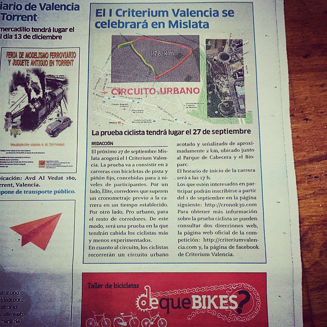 Criterium Valencia llega a la prensa local! #criteriumvalencia #criterium #dequebikesmislata… (dequebikes) Criterium Valencia llega a la prensa local! #criteriumvalencia #criterium #dequebikesmislata #dequebikes #DQB #cinelli2014 #ridehard #divendres #opticasavis #fixedgear #bikeporn #4tuneapparel #ingeniaprint #kiasantiagoautomocion #lovevalencia #urbanfixiestyle